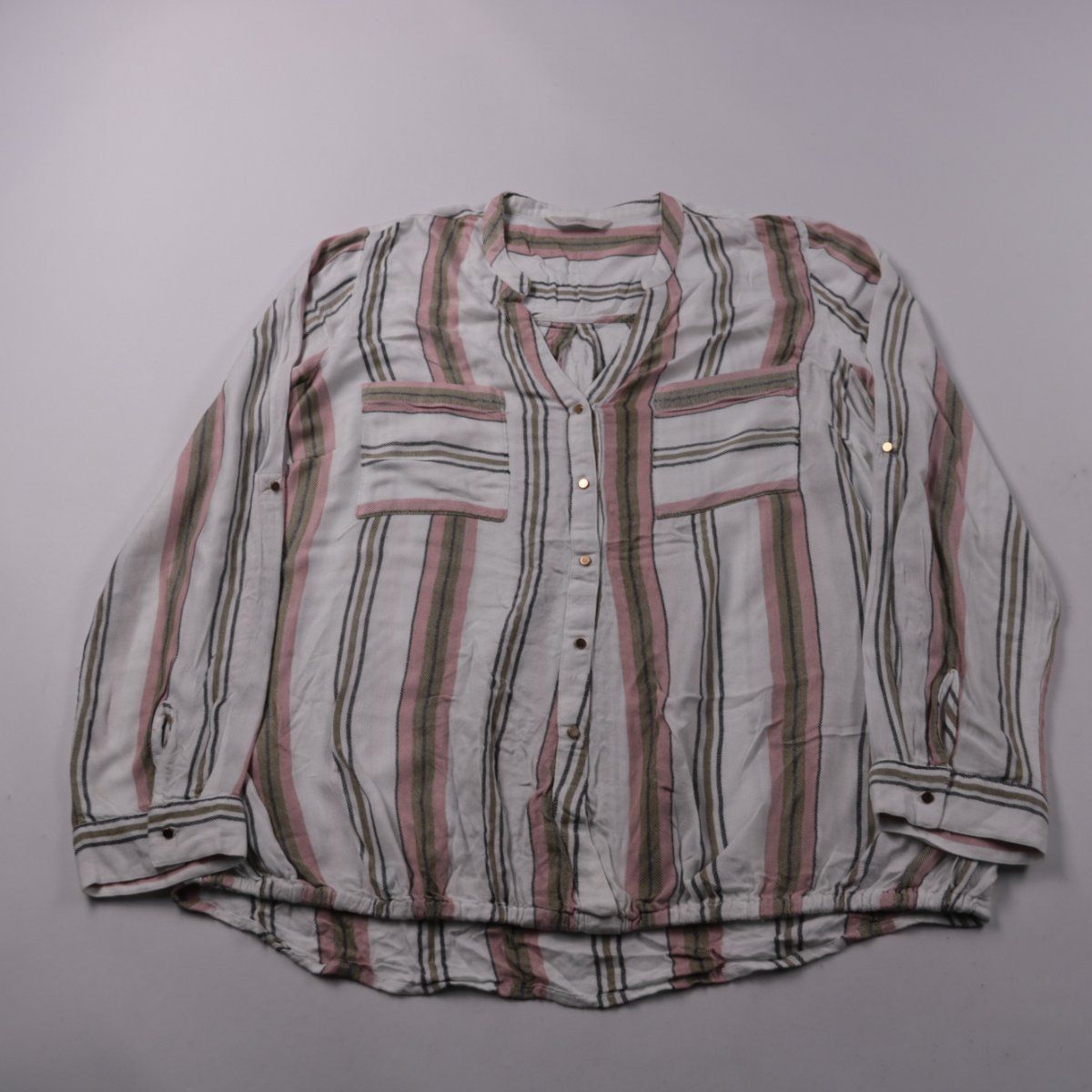 Блузка George в полоску, с V-образным вырезом и застёжкой на пуговицы, есть накладные карманы на груди. Подойдёт для офиса и повседневных образов, легко сочетается с джинсами и юбками. Вискоза приятна к телу и хорошо дышит.
