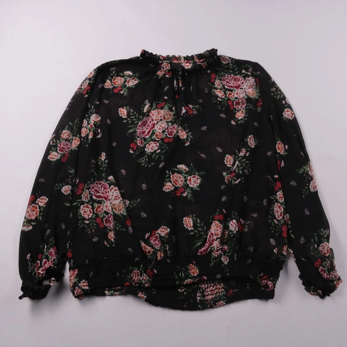 Блузка Peacocks из лёгкой ткани с цветочным принтом на чёрном фоне и длинными рукавами. Подойдёт для повседневных образов и офиса с однотонными брюками или юбкой. Эластичные манжеты и низ помогают посадке и не стесняют движения.