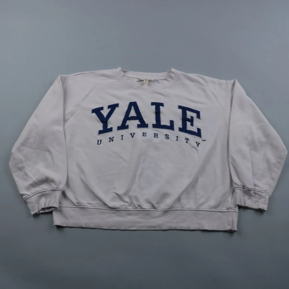 Свитшот H&M светло-серого цвета с принтом YALE UNIVERSITY и круглым вырезом. Подойдёт для повседневных образов и учебы в прохладную погоду. Мягкий футер с начёсом внутри хорошо сохраняет тепло и комфортен в носке.