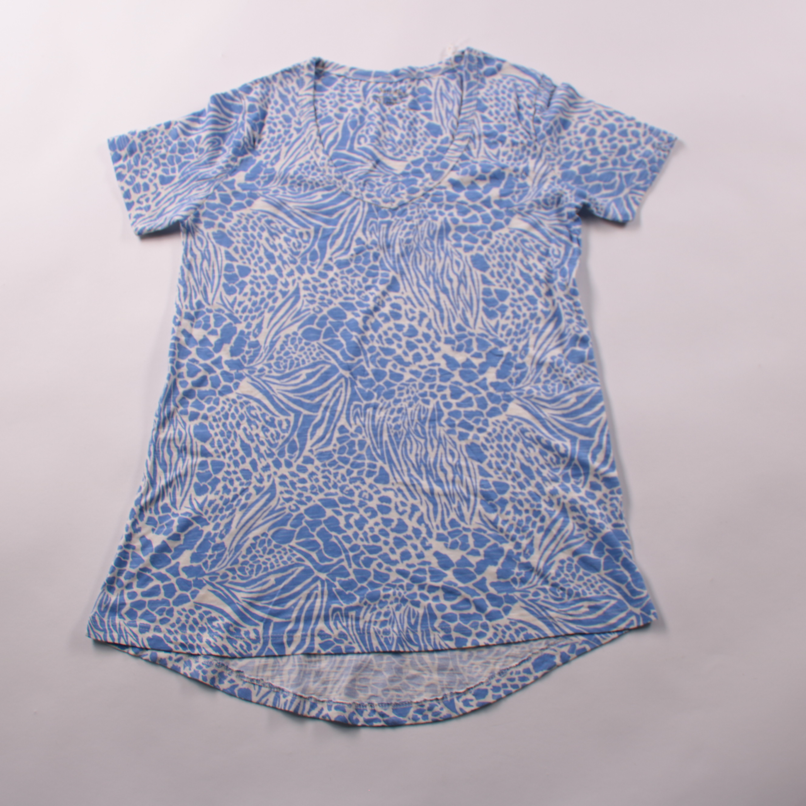 Женская футболка Nutmeg свободного кроя с голубым анималистичным принтом и округлым вырезом. Подойдёт на каждый день и для отдыха, легко сочетается с джинсами/шортами и однотонными низами. Мягкий трикотаж из хлопка с модалом приятен к телу и хорошо дышит.