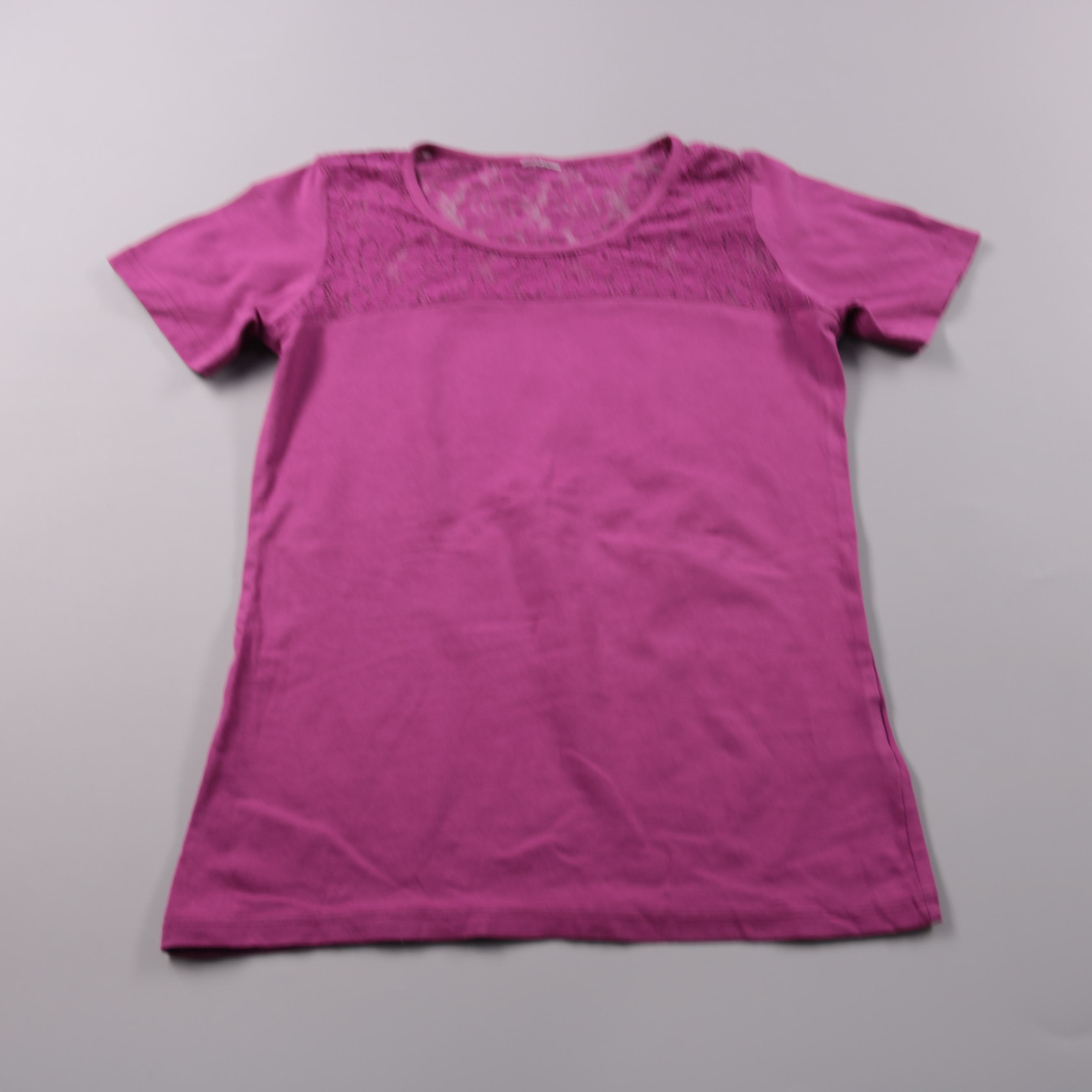 Женская футболка с кружевной вставкой в верхней части спереди, цвет насыщенный розово-фиолетовый. Подойдёт для повседневных образов и офиса с жакетом, хорошо сочетается с джинсами и юбками. Ткань тянется за счёт эластана, поэтому удобно сидит и не сков...
