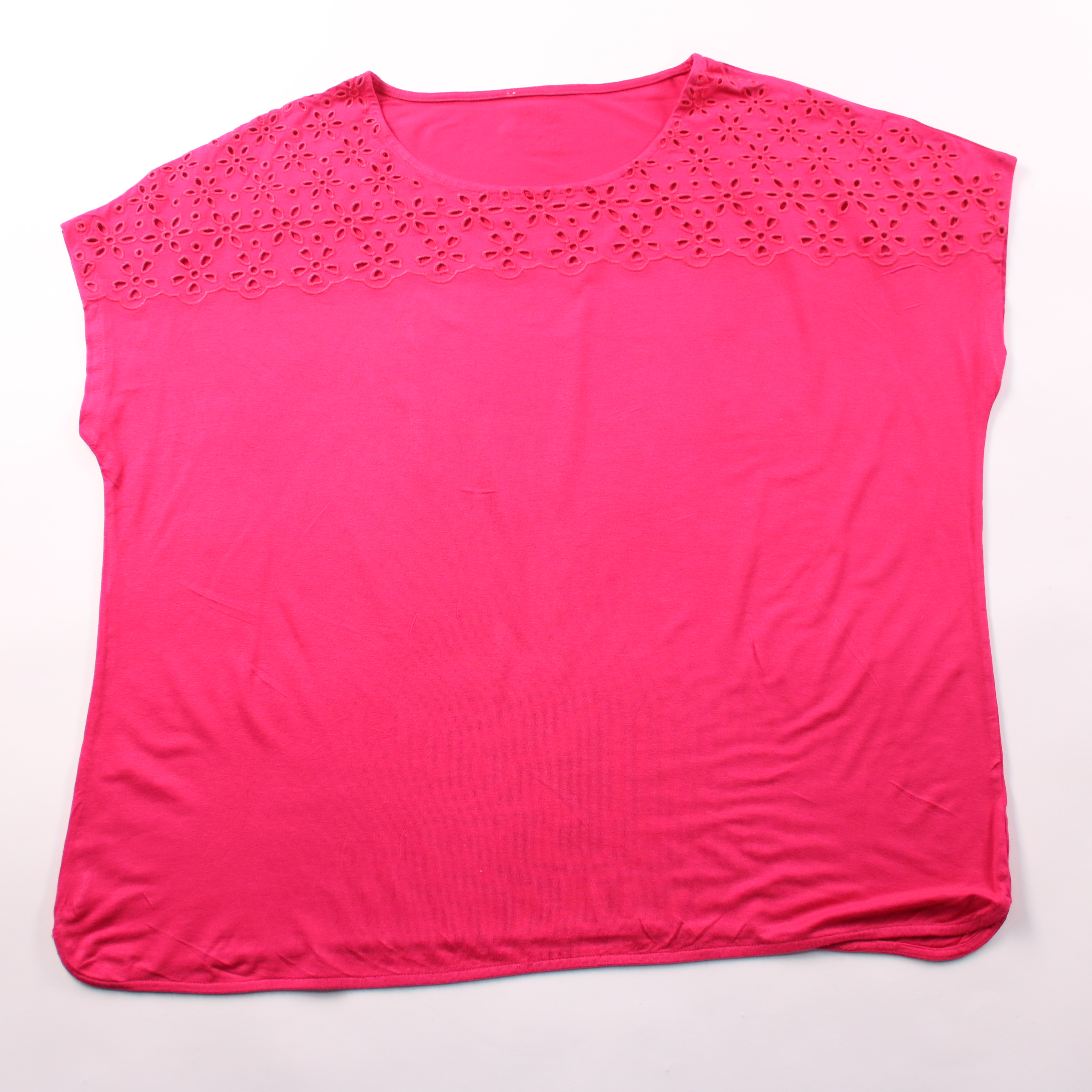 Женская футболка без бренда ярко-розового цвета с декоративной перфорацией по линии плеч. Подойдёт для лета и тёплой погоды, легко сочетается с джинсами, шортами и юбками. Мягкий трикотаж комфортно носится и не сковывает движения.