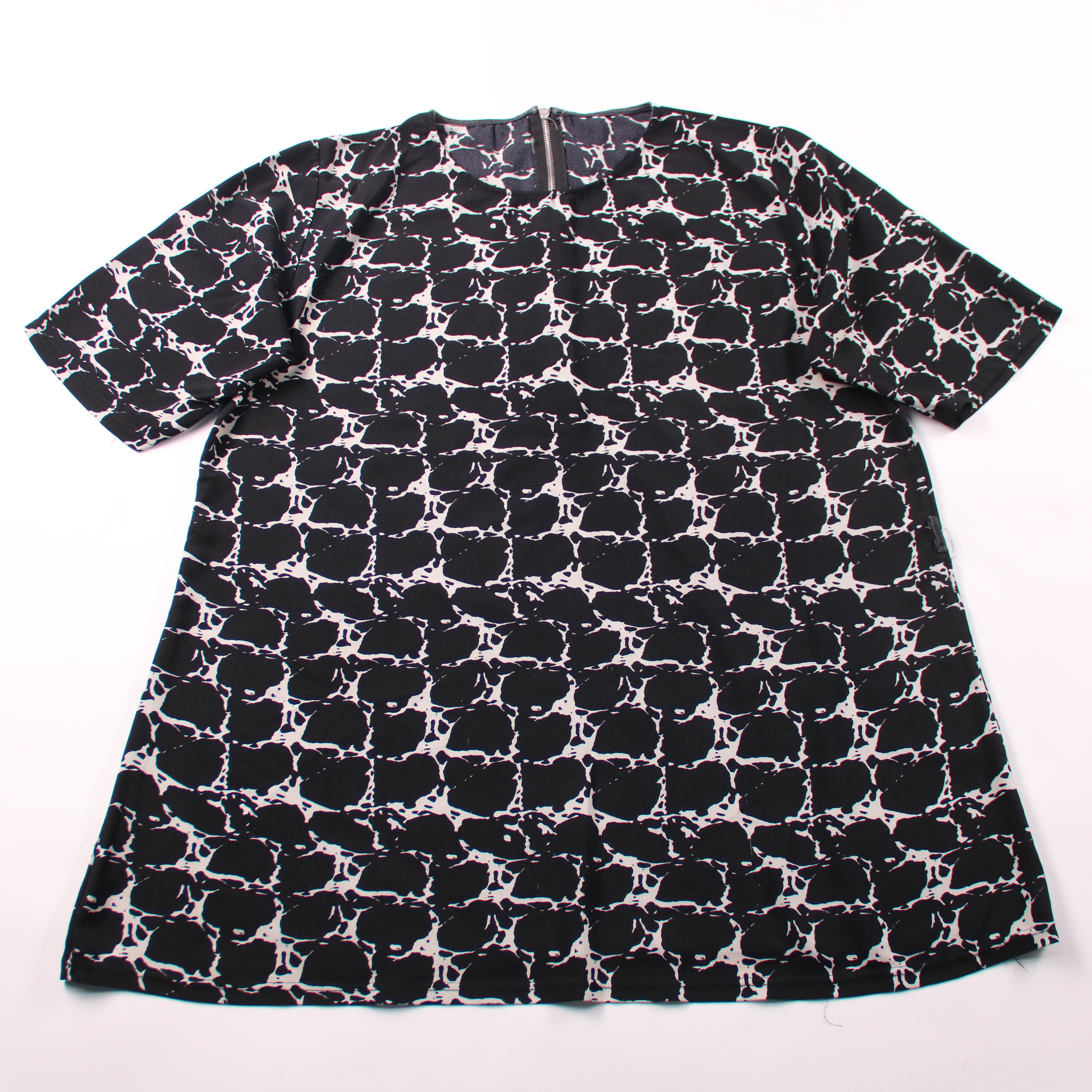 Платье с коротким рукавом и графичным черно-белым принтом, застёжка-молния сзади. Подойдёт для повседневных образов и офиса с однотонными аксессуарами. Смесовый хлопок (65% хлопок, 35% полиэстер) практичен и проще в уходе.