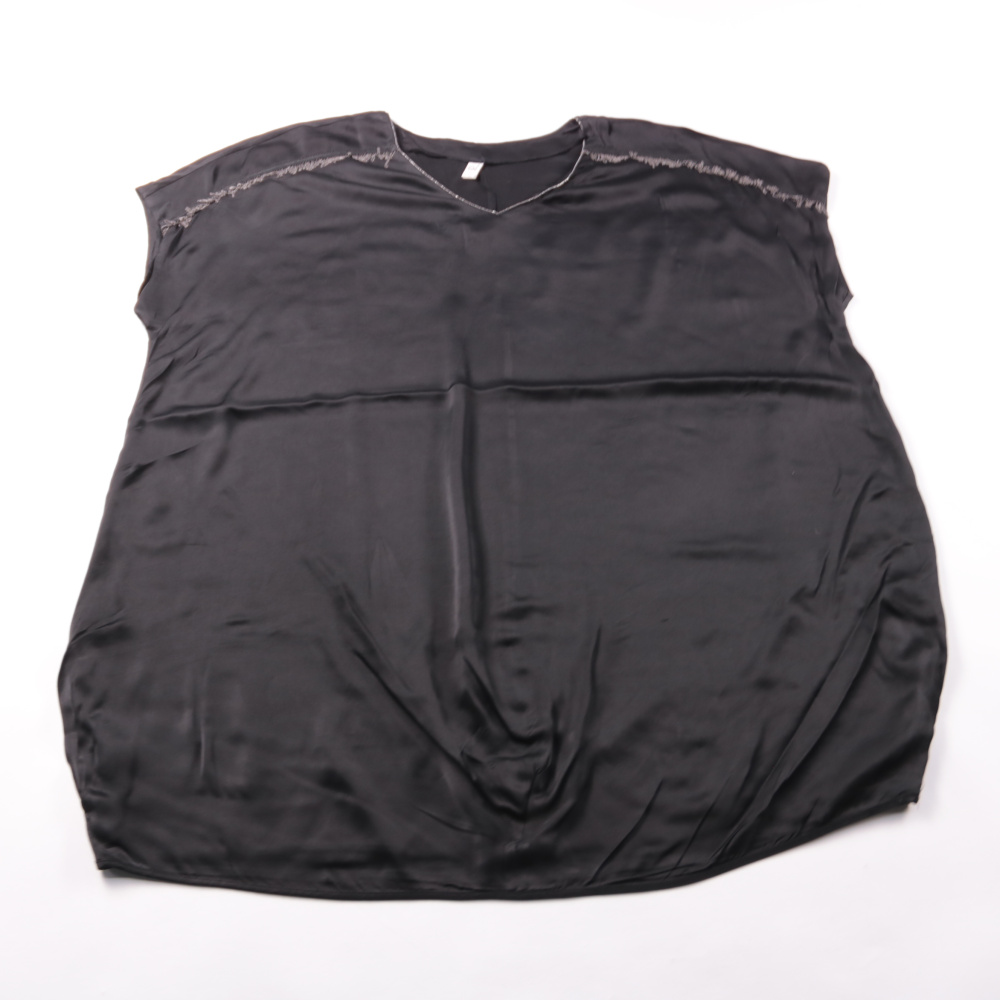 Чёрный женский топ свободного кроя из мягкой вискозы, с V-образным вырезом и декоративной отделкой по плечам. Подойдёт для повседневных образов и офиса в сочетании с брюками или юбкой. Лёгкая ткань комфортно дышит и приятно ощущается на коже.