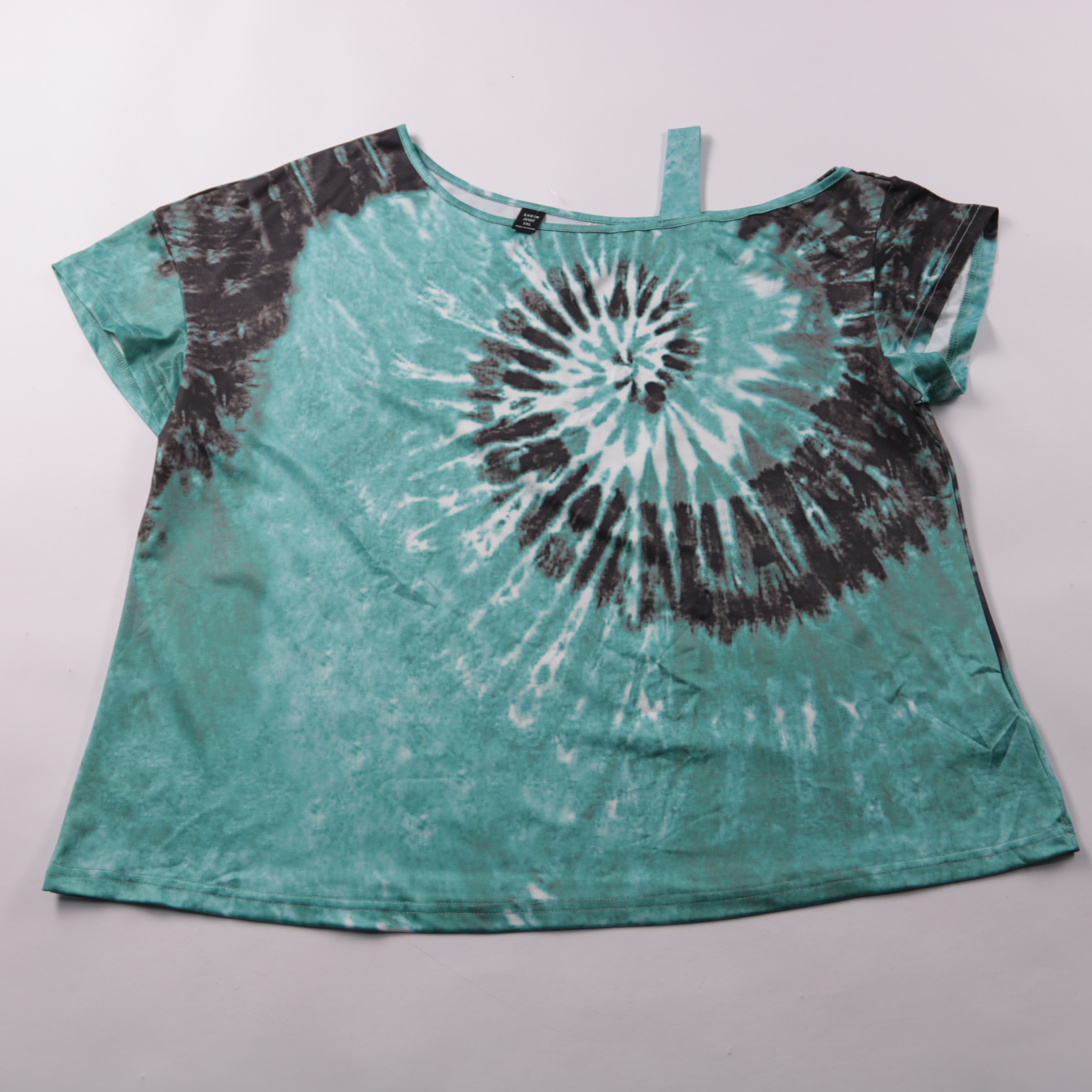 Женская футболка SHEIN Curve с принтом тай-дай в бирюзово-чёрной гамме и свободным кроем. Подойдёт для повседневных летних образов и отдыха, хорошо сочетается с джинсами и шортами. Тянется за счёт эластана и почти не мнётся благодаря полиэстеру.