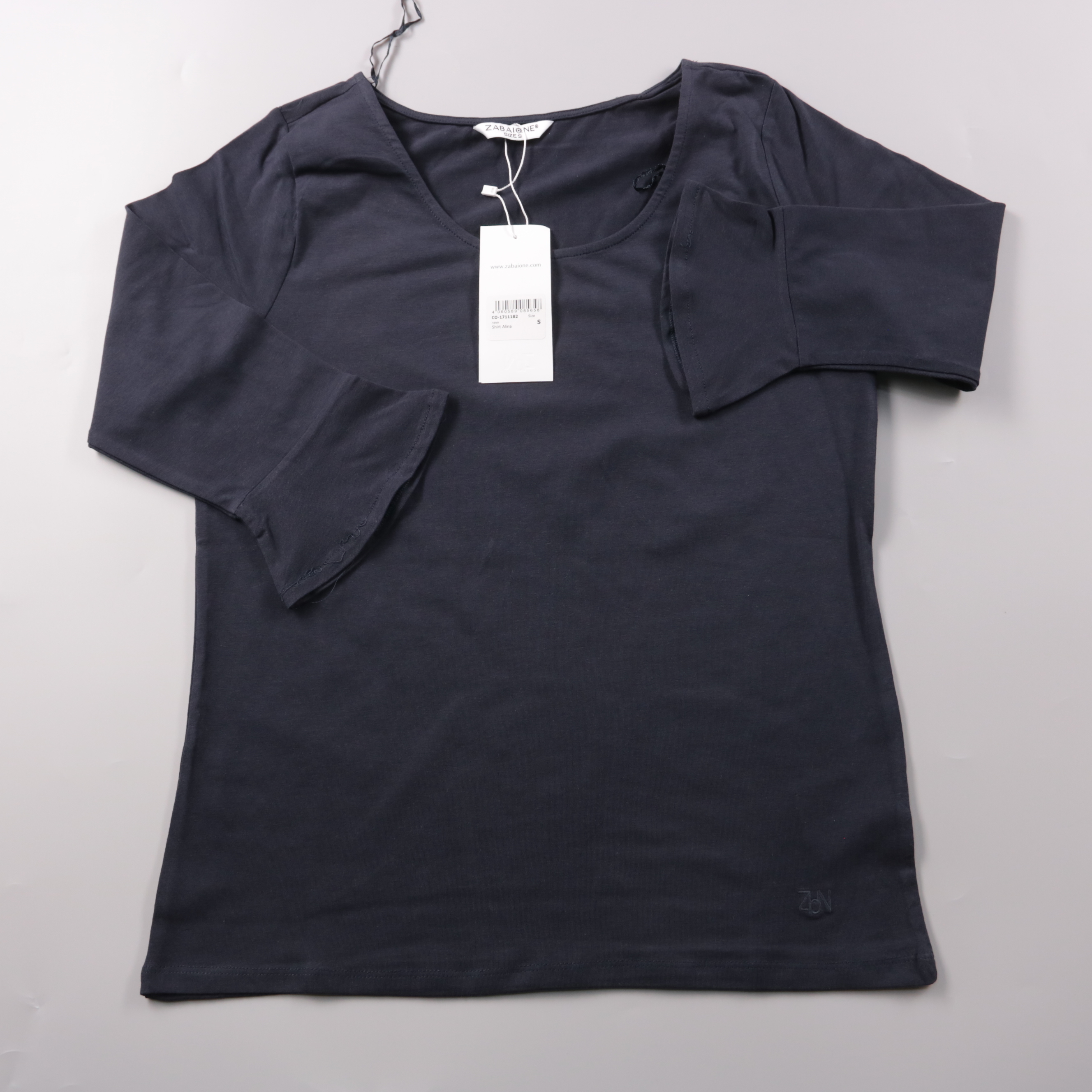 Футболка Zabaione в тёмно-синем (navy) цвете с круглым вырезом и рукавом 3/4. Подойдёт для повседневных образов и офисного casual, легко сочетается с джинсами и юбками. Хлопковая ткань с эластаном хорошо тянется и комфортно сидит по фигуре.