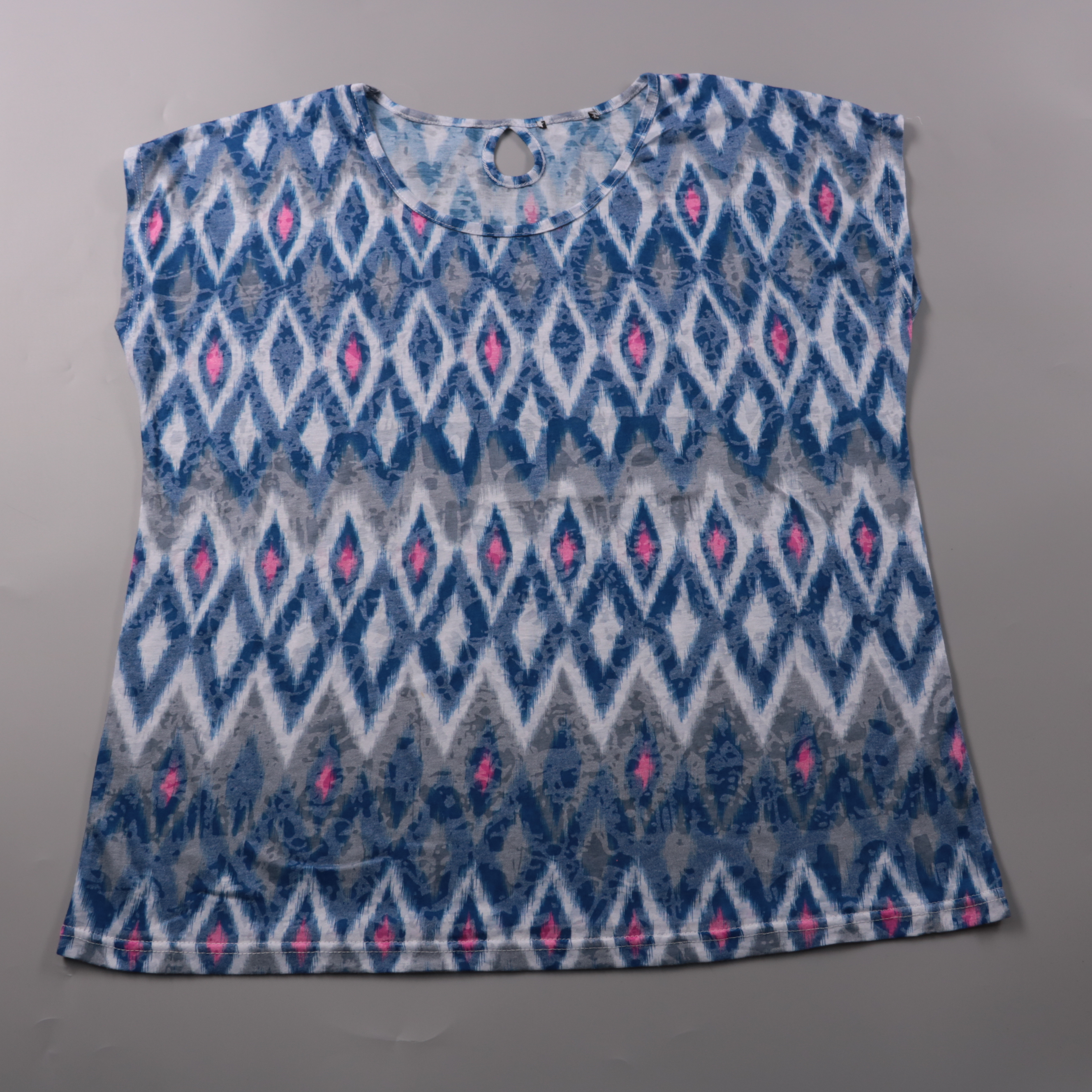 Женский топ без рукавов с геометрическим принтом в сине-бело-розовой гамме и круглым вырезом с капелькой сзади. Подойдёт для лета и отдыха, хорошо сочетается с джинсами, шортами или юбкой. Материал лёгкий и быстро сохнет, удобно брать в поездки.