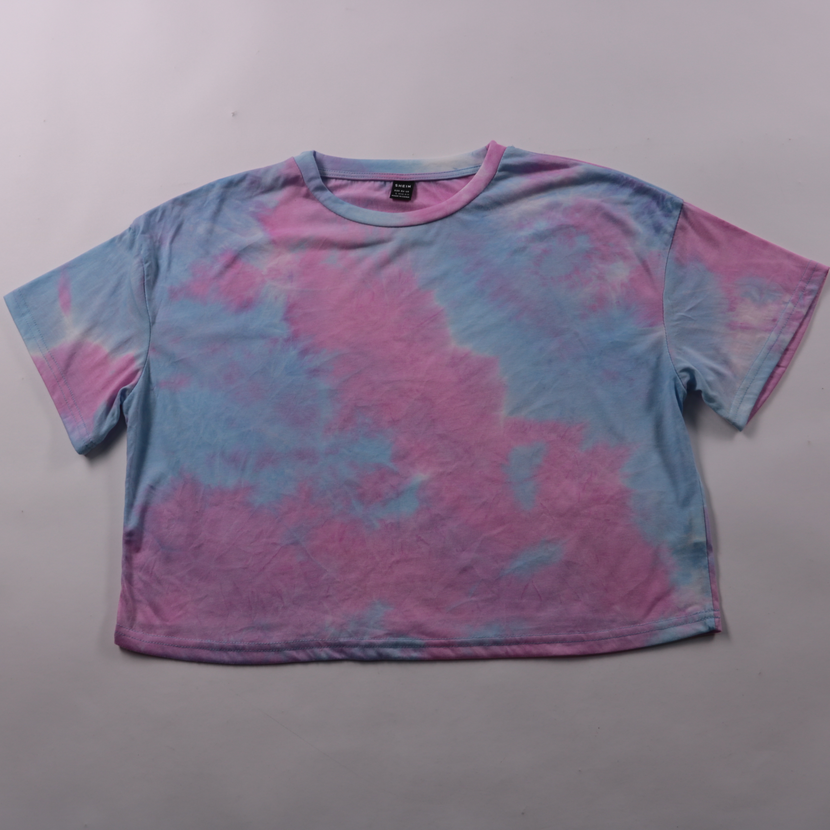 Футболка Shein свободного кроя с принтом тай-дай в розово-голубых оттенках. Подойдёт для повседневных летних образов и домашней носки, легко сочетается с джинсами и шортами. Материал хорошо тянется и комфортно сидит по фигуре.