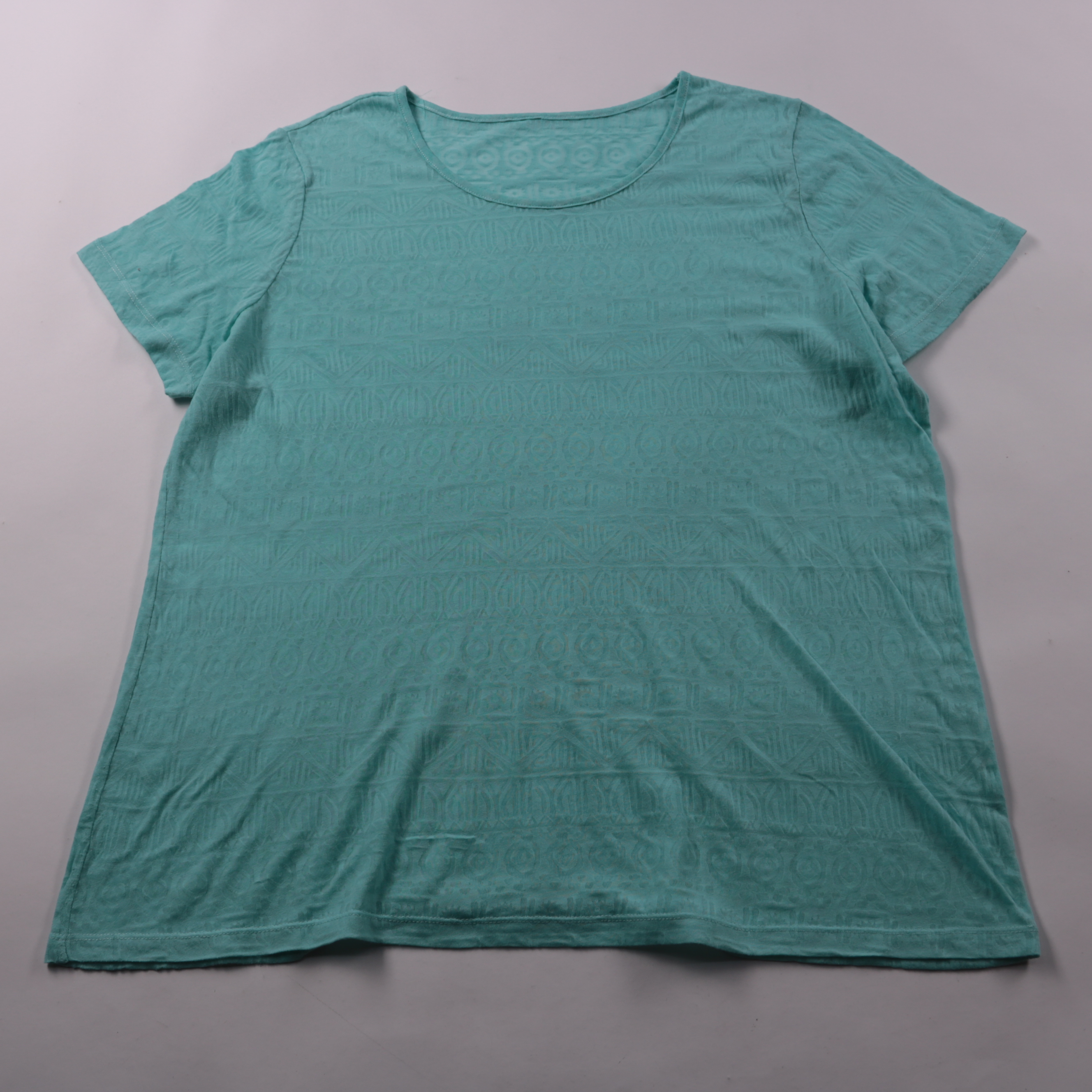 Женская футболка бирюзового цвета с фактурным жаккардовым узором и округлым вырезом. Подойдёт для повседневных образов и офиса в стиле casual, легко сочетается с джинсами и юбками. Мягкий трикотаж комфортно носится и не стесняет движений.