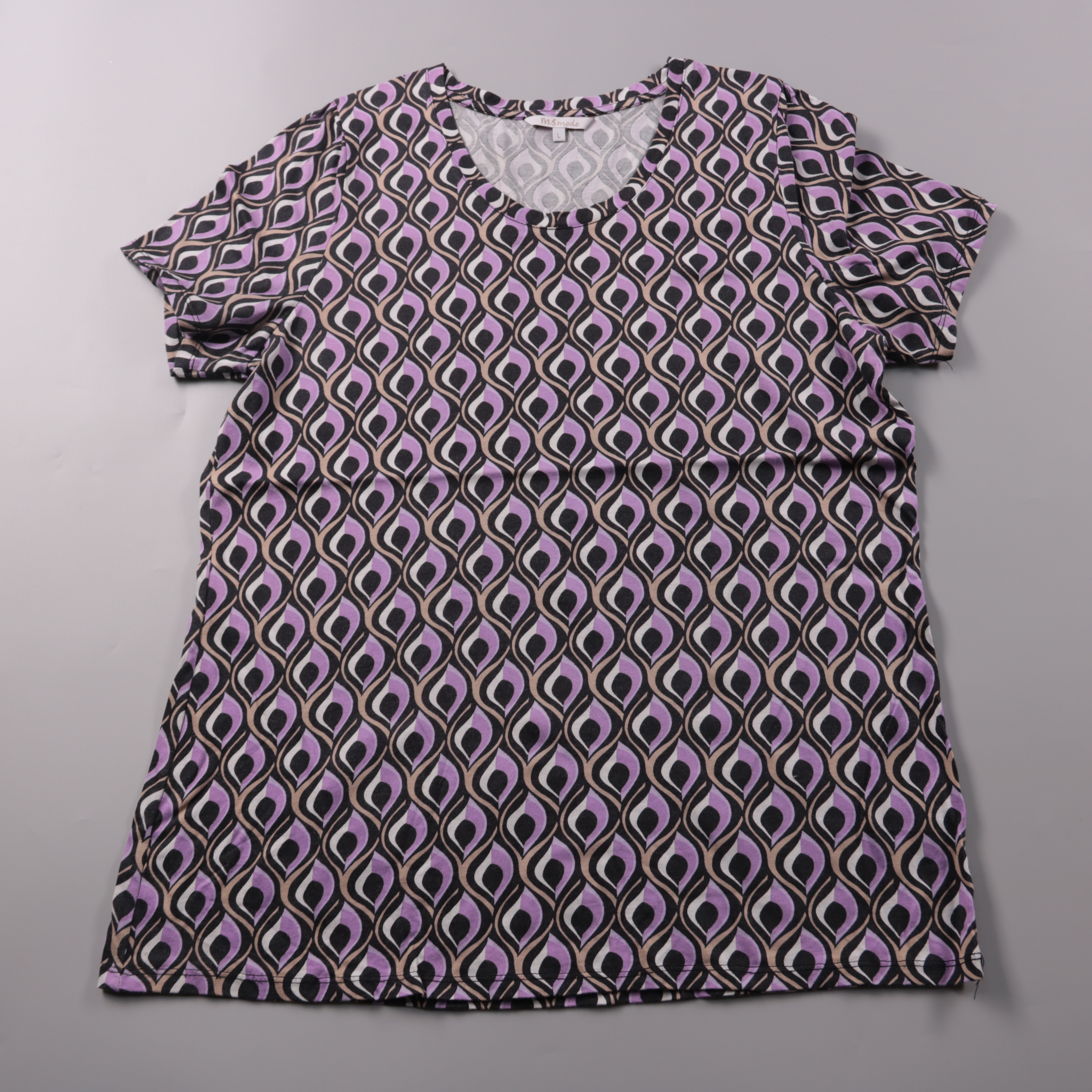 Футболка Ms Mode с коротким рукавом и геометрическим принтом в черно-фиолетовой гамме. Подойдет на каждый день и для офиса в стиле casual, хорошо сочетается с однотонными джинсами или юбкой. Трикотаж на основе хлопка и модала мягкий и комфортный в носке.