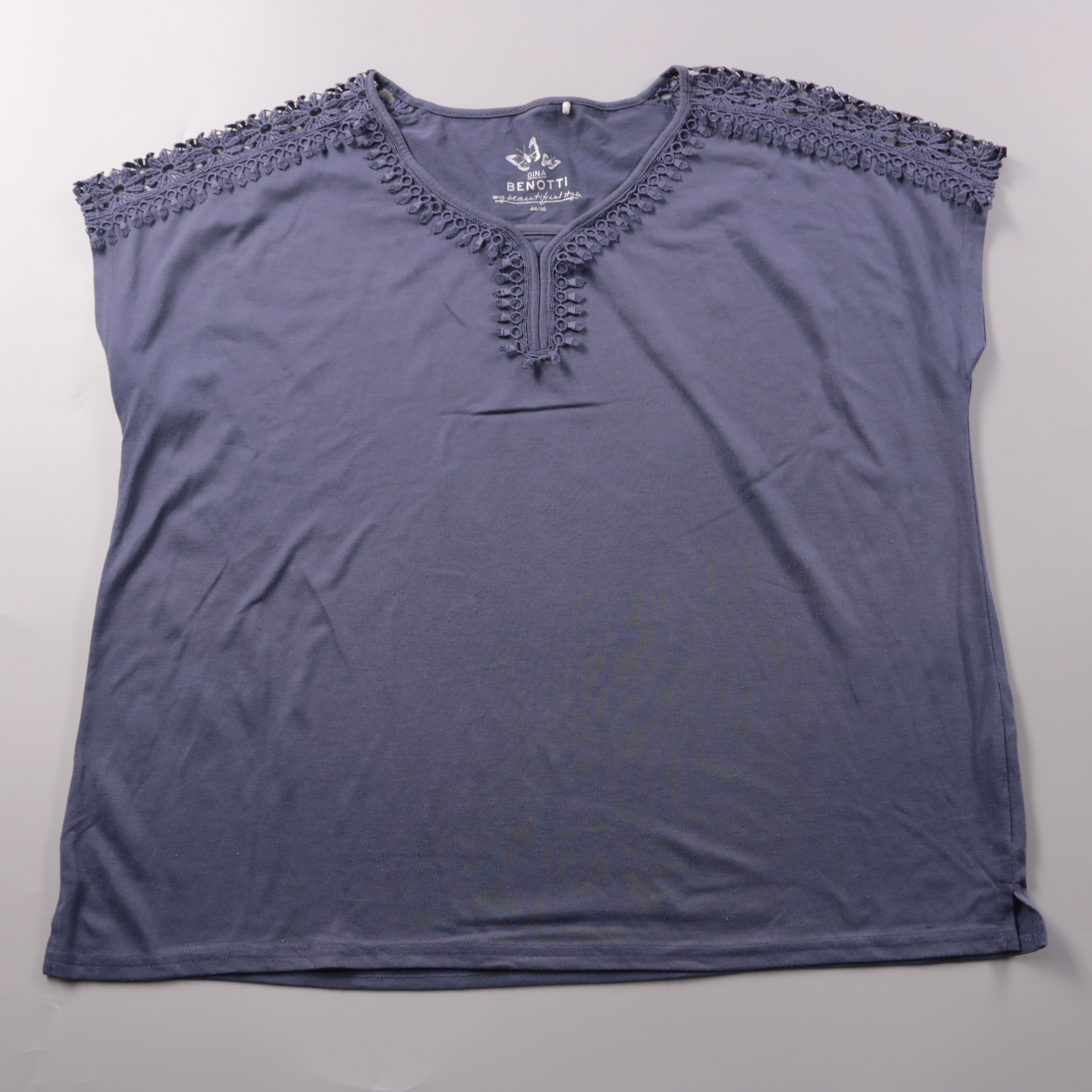 Футболка Gina Benotti синего цвета с V-образным вырезом и кружевной отделкой по плечам и горловине. Подойдёт для повседневных образов летом и в тёплый демисезон под жакет или кардиган. Ткань мягкая и не мнётся так сильно за счёт полиэстера, поэтому удо...