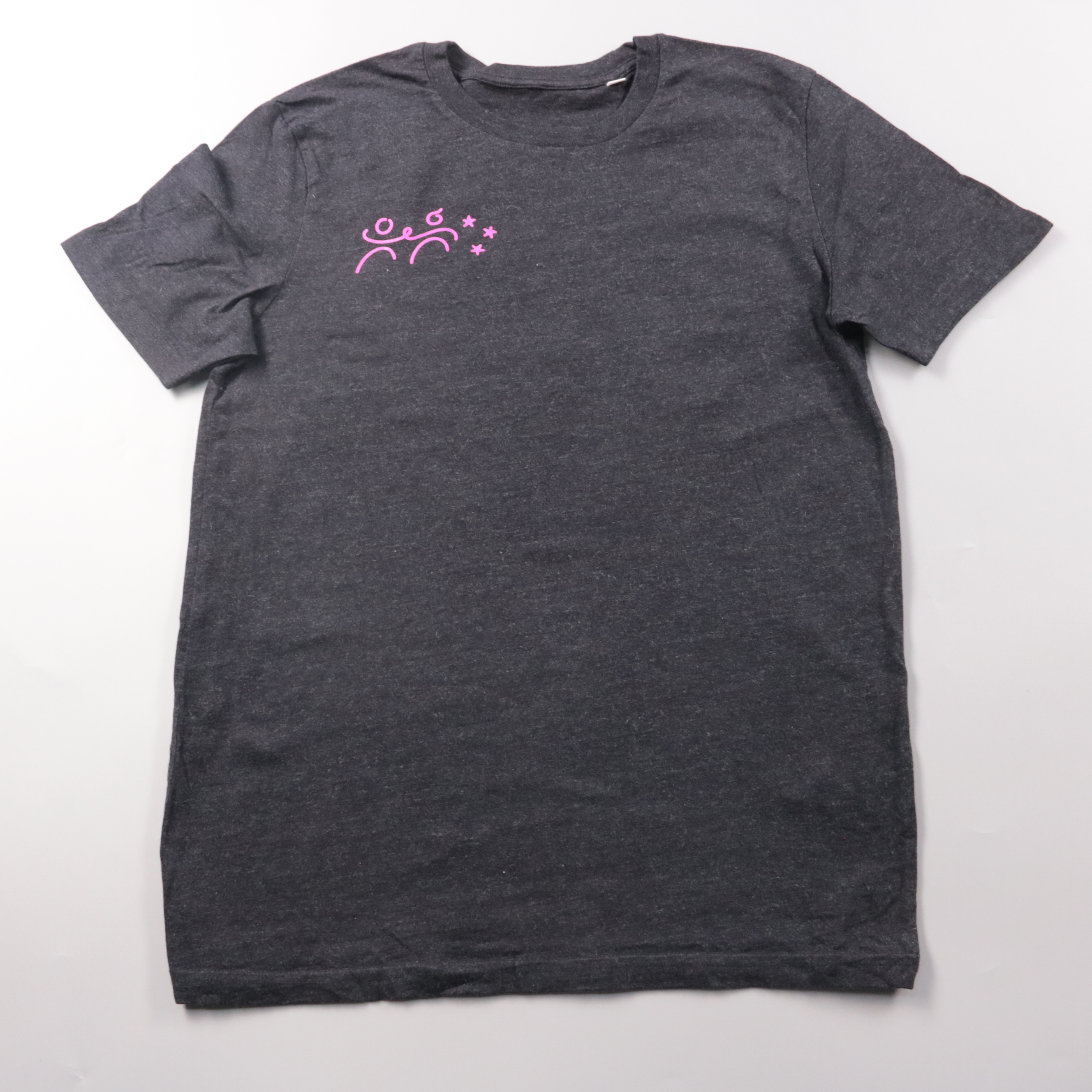Тёмно-серая футболка из органического хлопка с небольшим розовым принтом на груди. Подойдёт для повседневных образов и как базовый слой под худи или жакет. Натуральный хлопок хорошо дышит и приятен к телу.