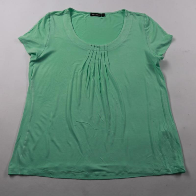 Женская футболка Basic Style мятного цвета с круглым вырезом и декоративными складками спереди. Подойдёт для повседневных летних образов и офиса с жакетом. Ткань с вискозой и эластаном мягкая и тянется, поэтому комфортно сидит по фигуре.