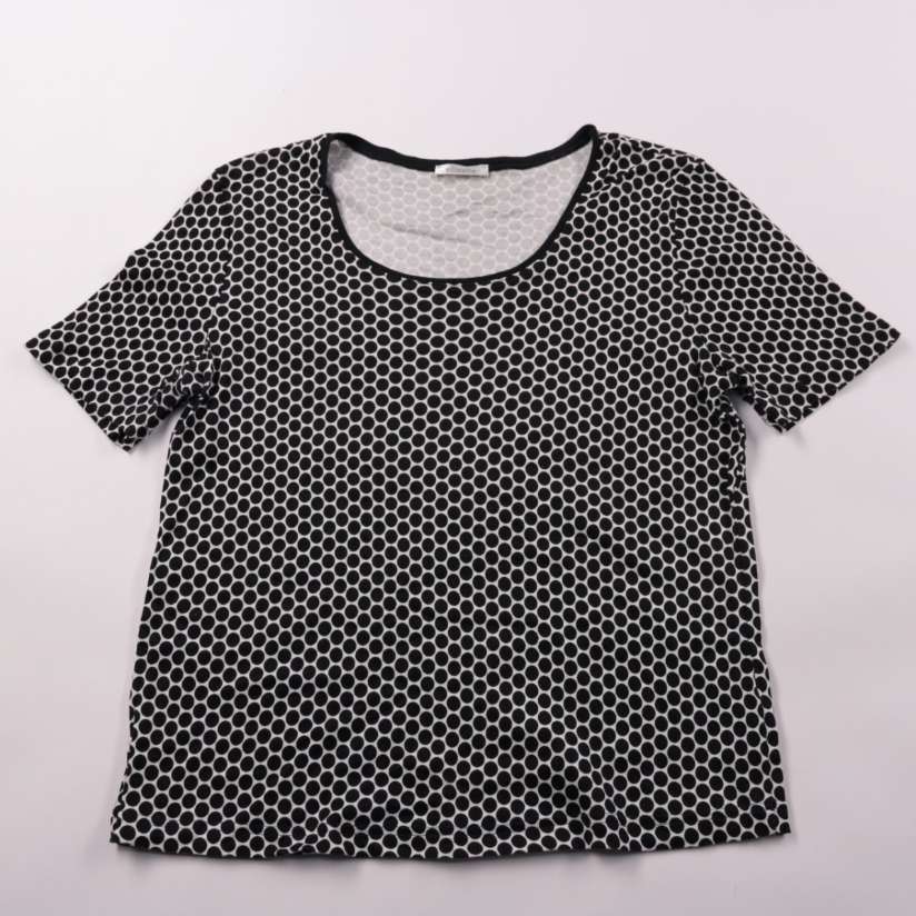 Футболка Efixelle из 100% мерсеризованного хлопка, чёрно-белая в мелкий горошек с круглым вырезом. Подойдёт на каждый день и для офиса, легко сочетается с однотонными брюками, джинсами или юбкой. Мерсеризованный хлопок приятен к телу и хорошо держит фо...