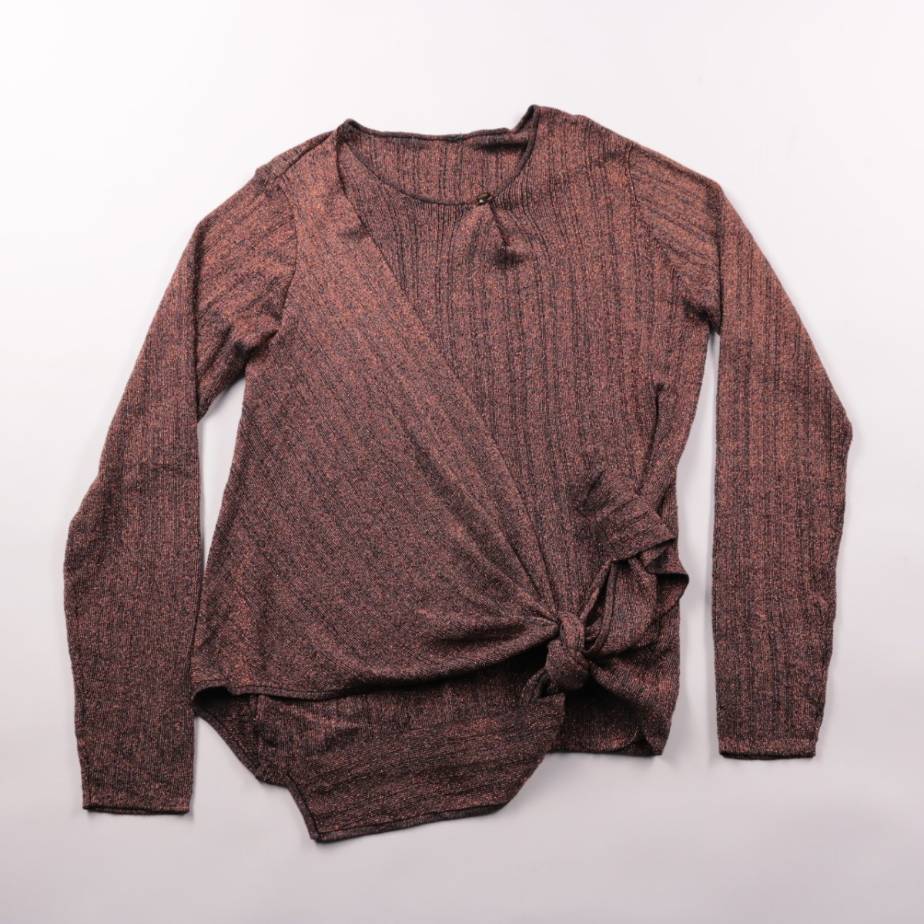 Женский лонгслив на запах с завязкой сбоку, с фактурной вязкой и легким металлическим блеском. Подойдет для повседневных образов и вечера, хорошо смотрится с джинсами и юбками. Материал мягкий и тянется, поэтому удобно садится по фигуре.