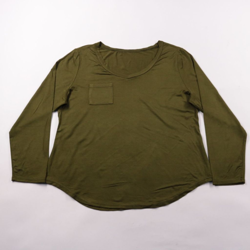 Женский лонгслив цвета хаки с круглым вырезом и накладным карманом на груди. Подойдёт для повседневных образов и как базовый слой в прохладную погоду. Мягкий трикотаж хорошо тянется и не сковывает движения.