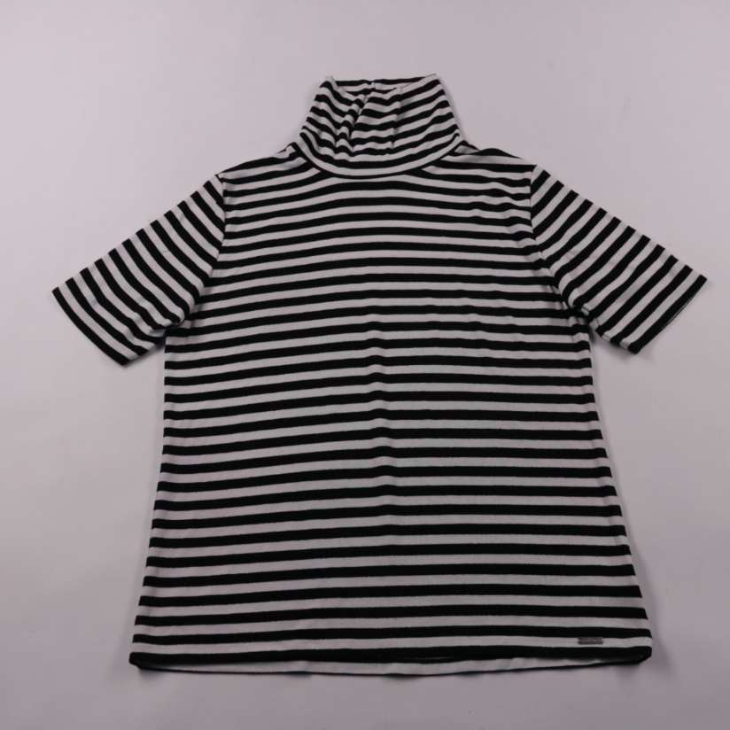 Лонгслив SIXTH SENSE в чёрно-белую полоску с коротким рукавом и высоким воротником. Подойдёт для повседневных образов и многослойных сочетаний в прохладную погоду. Трикотаж тянется и комфортно садится по фигуре.
