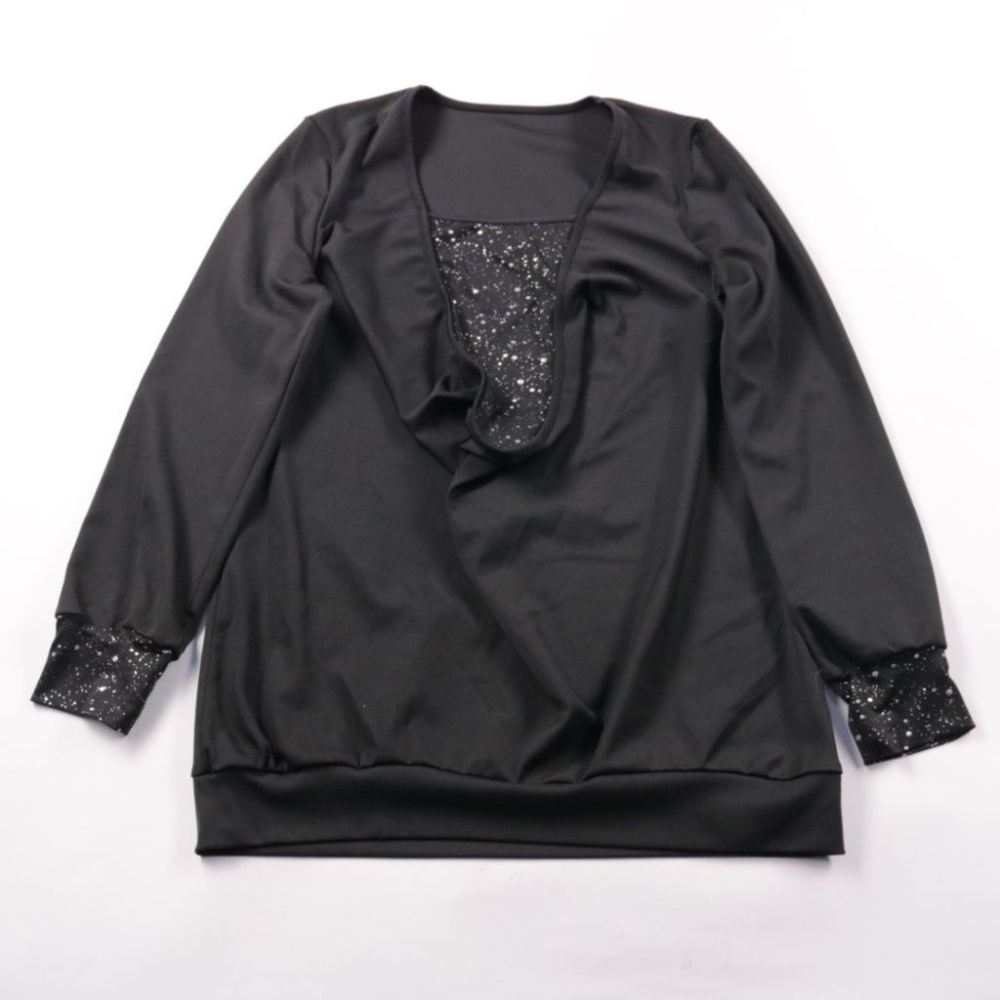 Женский чёрный лонгслив с декоративной вставкой с блёстками на груди и манжетах. Подойдёт для повседневных образов и на выход, хорошо сочетается с джинсами и юбками. Плотные манжеты и низ держат форму и аккуратно сидят по фигуре.