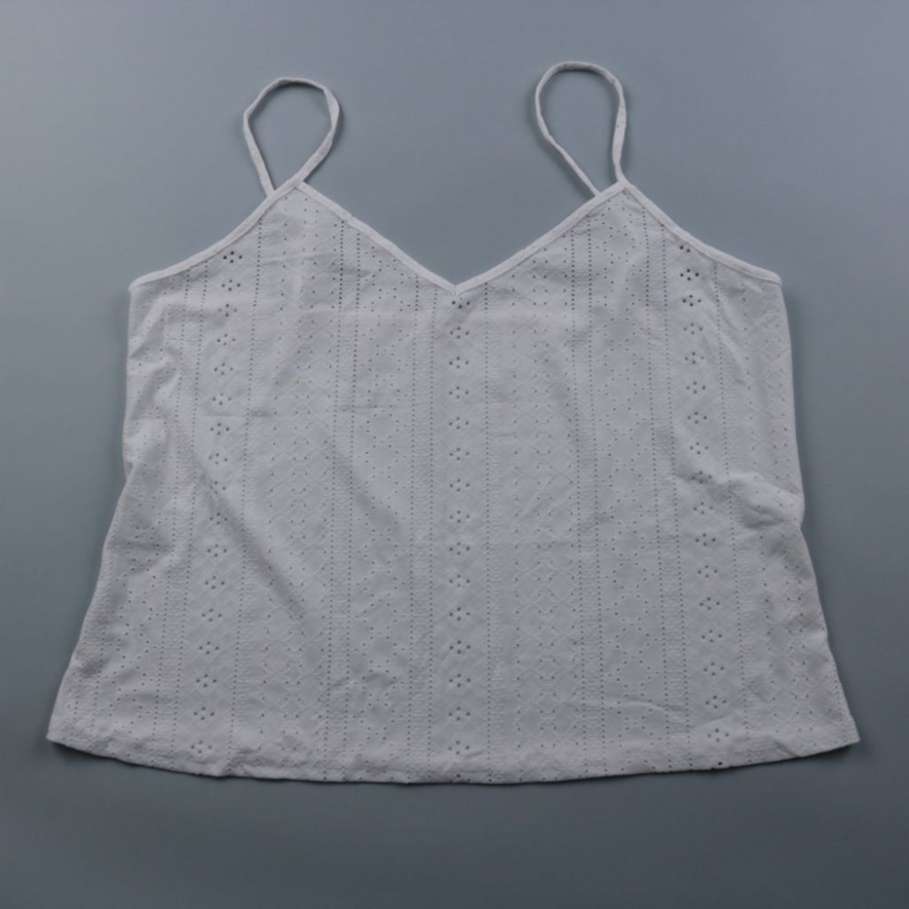Белый топ Shein Curve на тонких бретелях, выполнен из ткани с перфорацией (английская вышивка). Подойдёт для лета и отпускных образов, хорошо смотрится с шортами, юбкой или джинсами. Лёгкий и быстро сохнет после стирки.