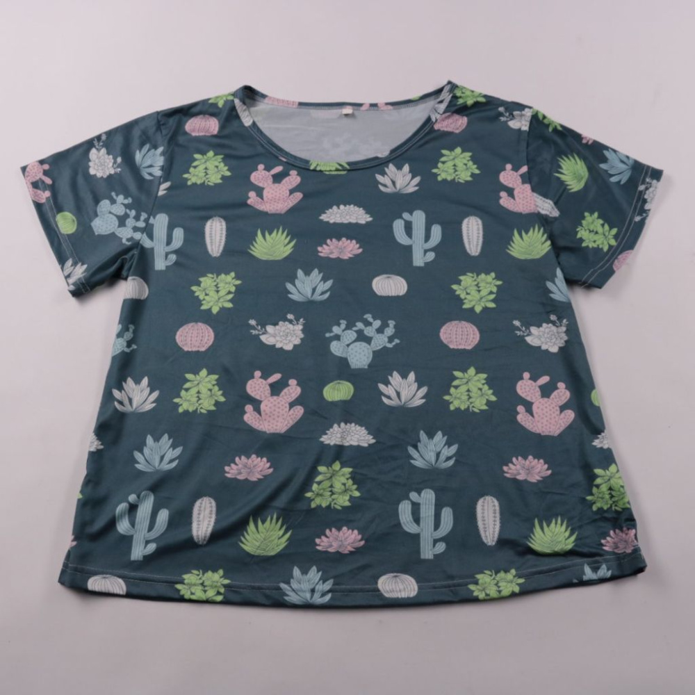 Женская футболка с принтом кактусов и суккулентов, свободного кроя с круглым вырезом. Подойдёт для повседневных летних образов, дома или поездок. Ткань с эластаном тянется и не сковывает движения.