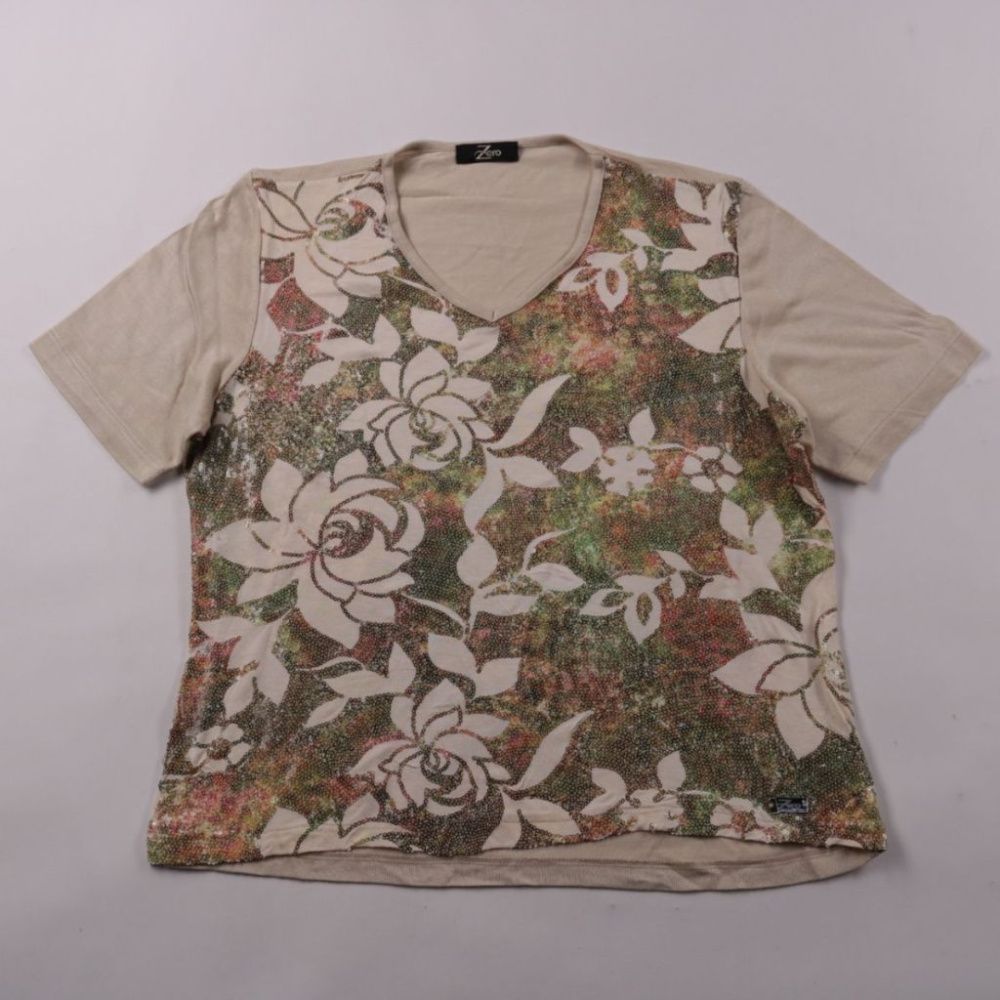 Женская футболка Zero бежевого цвета с цветочным принтом спереди и V-образным вырезом. Подойдёт для повседневных летних образов, хорошо сочетается с джинсами или однотонными брюками. Материал лёгкий и практичный, не требует сложного ухода.