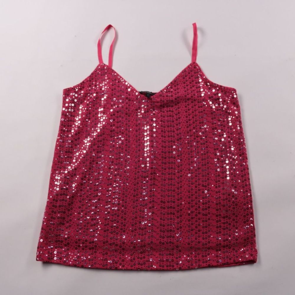 Топ Next на тонких бретелях, выполнен из ткани с пайетками в ярком розовом цвете. Подойдёт для вечеринки, праздника или выхода в клуб, хорошо смотрится как самостоятельный акцентный верх. Лёгкий и эластичный материал комфортно садится по фигуре.