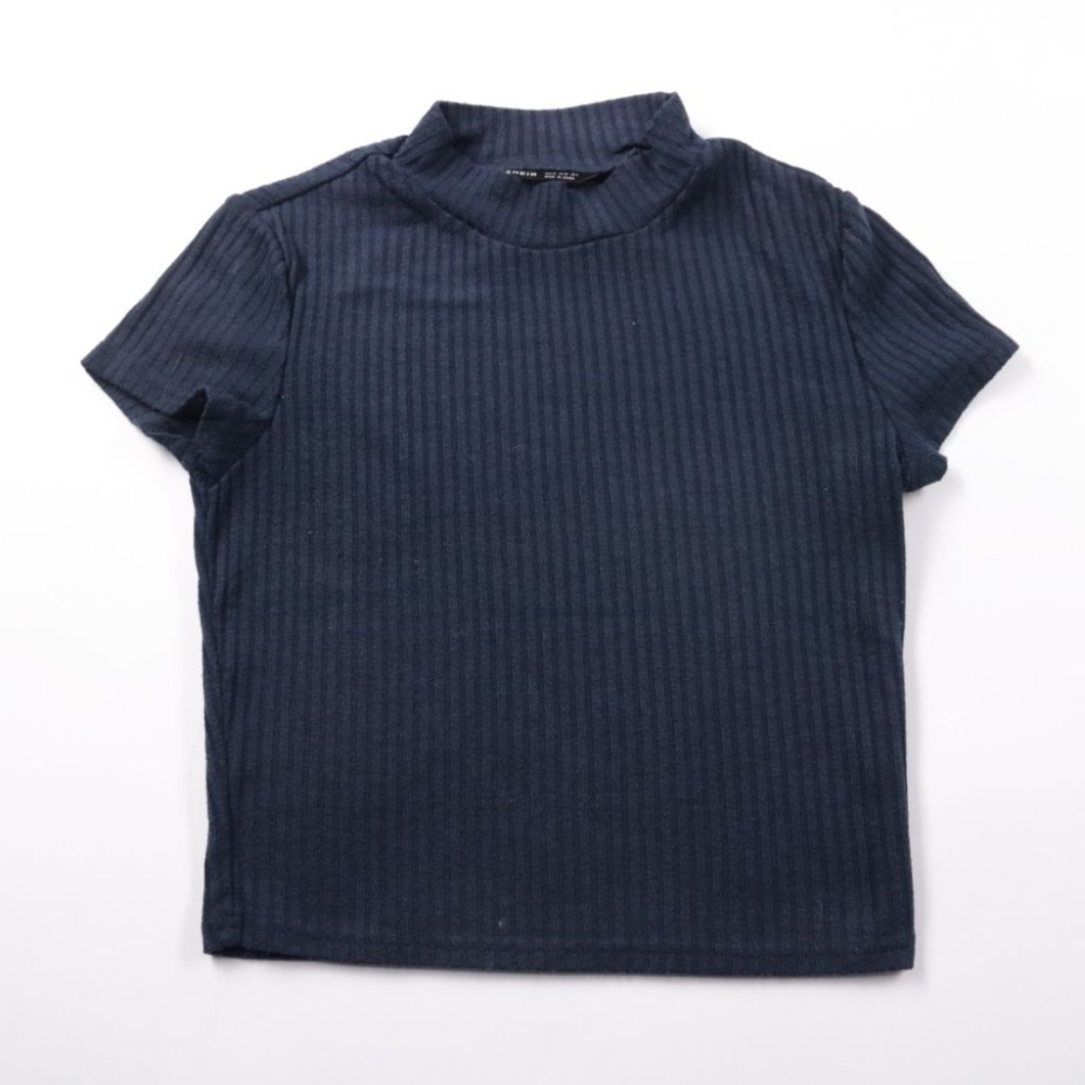 Женский лонгслив SHEIN в рубчик тёмно-синего цвета с коротким рукавом и воротником-стойкой. Подойдёт для повседневных образов и офиса, хорошо сочетается с джинсами и юбками. Трикотаж тянется и не стесняет движений, удобно носить под жакет или кардиган.