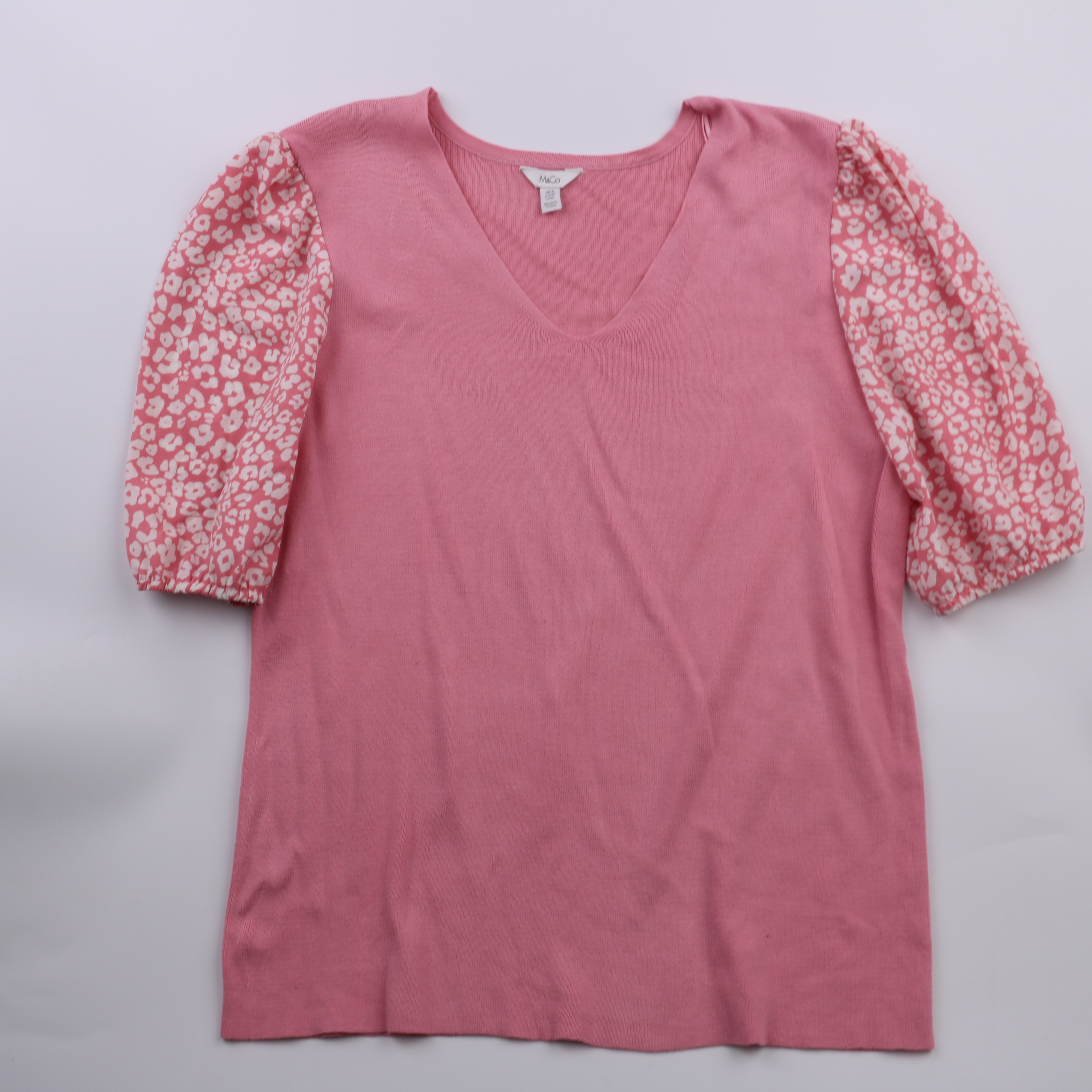 Футболка M&Co розового цвета с V-образным вырезом и объёмными рукавами с белым принтом. Подойдёт для повседневных образов с джинсами или юбкой в тёплую погоду и как слой под жакет в демисезон. Практичный трикотажный корпус приятен к телу и хорошо тянется.
