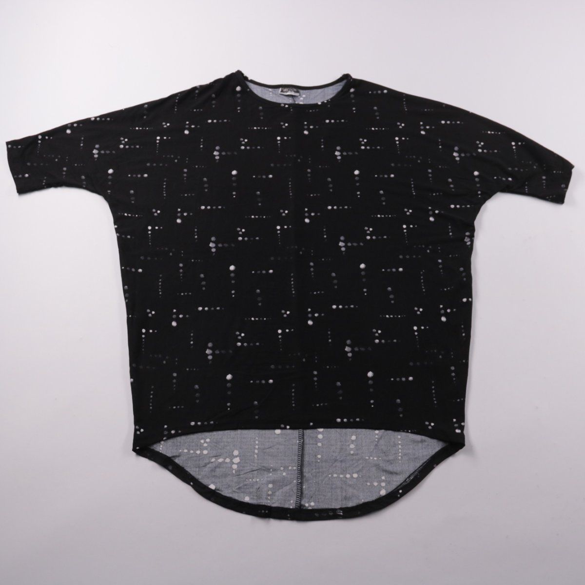 Футболка Beloved чёрного цвета с белым принтом в точку и удлинённой спинкой. Подойдёт для повседневных образов и прогулок, хорошо сочетается с джинсами и легинсами. Практичный плюс — синтетический материал почти не мнётся и быстро сохнет.