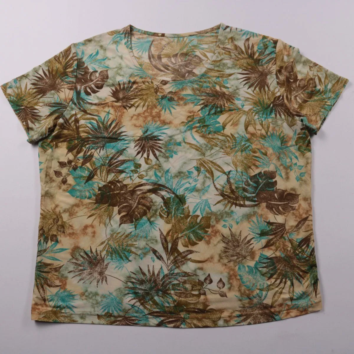 Женская футболка с тропическим растительным принтом в бежево-коричневой гамме с бирюзовыми акцентами. Подойдёт для повседневных летних образов и отпуска, хорошо сочетается с джинсами и шортами. Лёгкая ткань и короткий рукав делают её удобной в жаркую погоду.