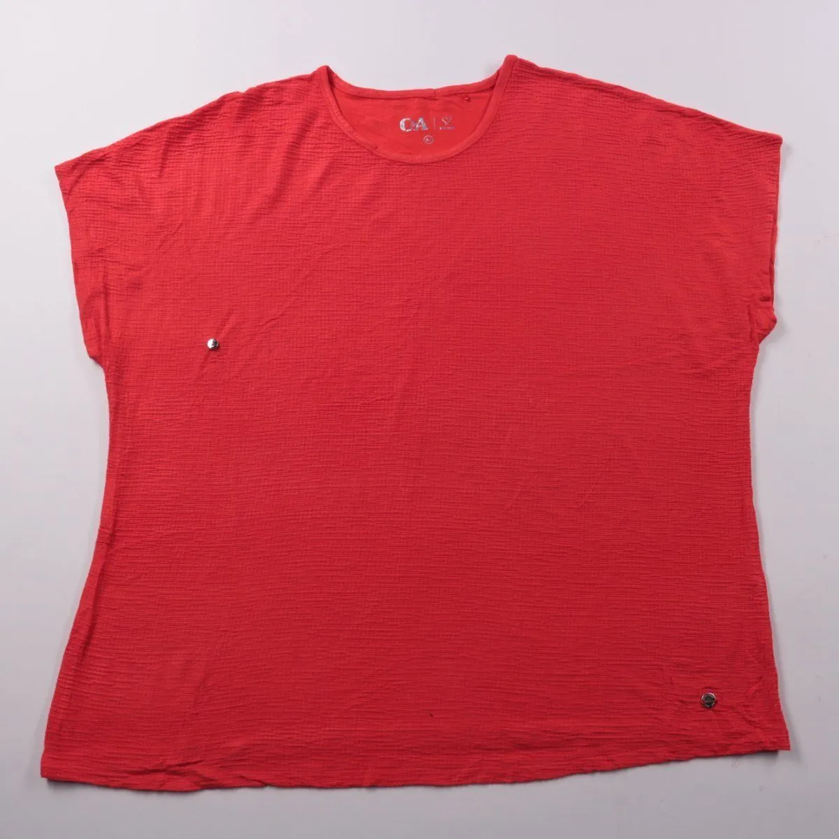Женская футболка C&A красного цвета свободного кроя с коротким рукавом и круглым вырезом. Подойдёт для повседневных летних образов, дома или отпуска. Лёгкий материал быстро сохнет и комфортно носится в жару.