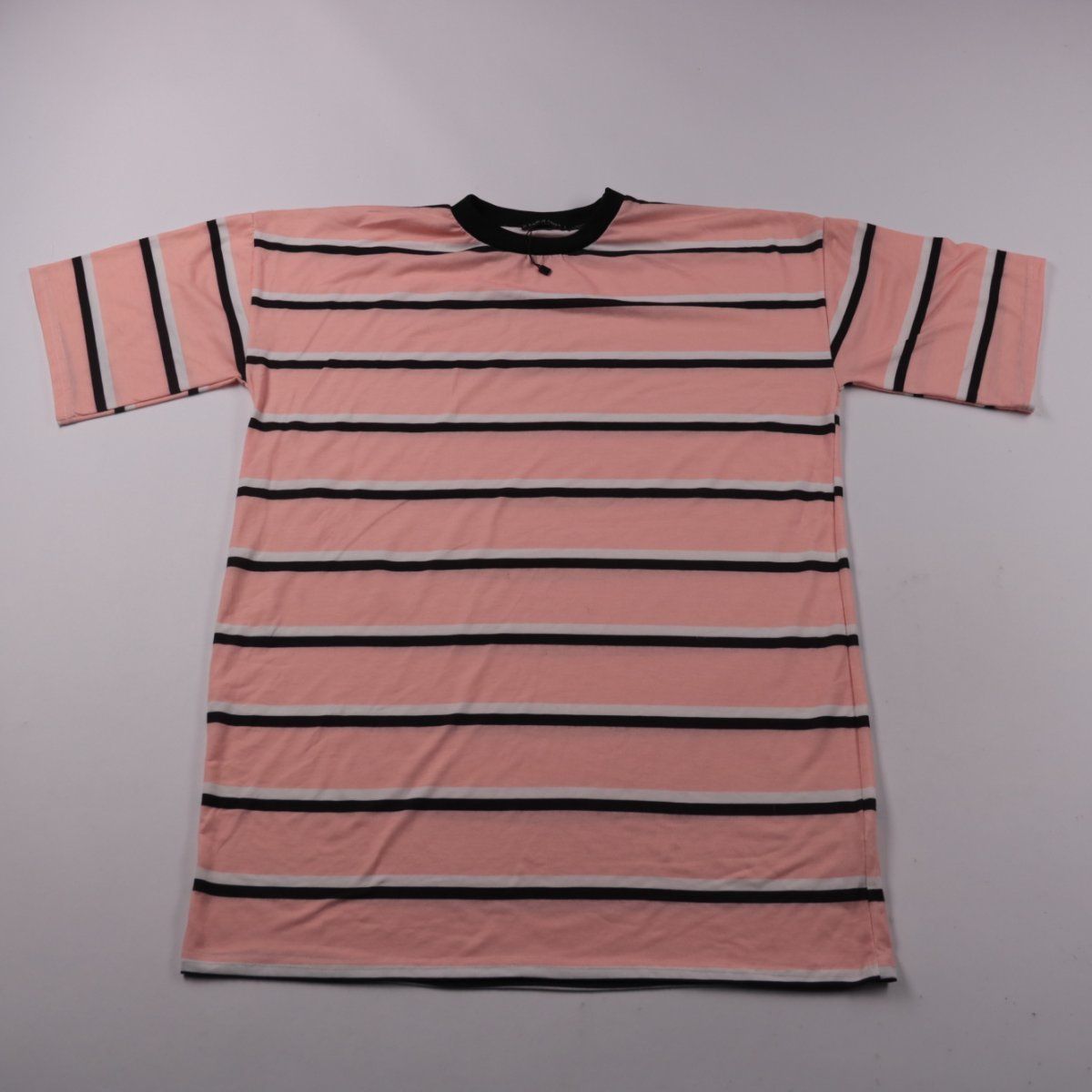 Футболка I SAW IT FIRST в розовом цвете с горизонтальными чёрно-белыми полосками и контрастной чёрной горловиной. Подойдёт для повседневных образов, прогулок и учёбы, легко сочетается с джинсами и шортами. Материал эластичный и не сковывает движения.