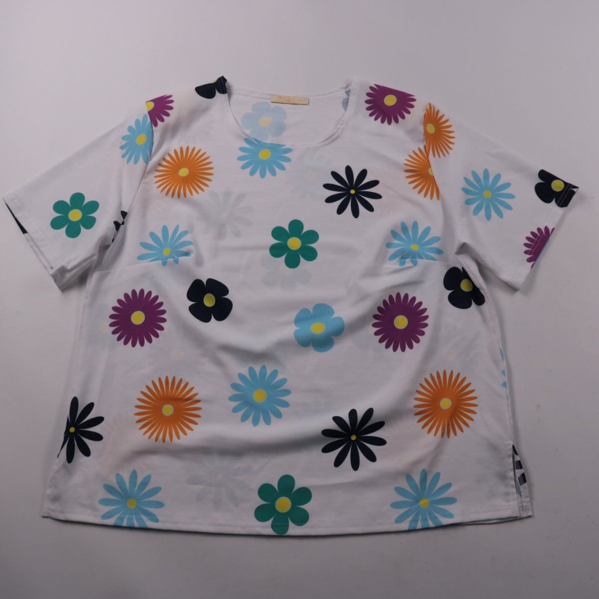 Женская футболка OZZA с круглым вырезом и ярким цветочным принтом на белом фоне. Подойдёт для повседневной носки и летних прогулок, легко сочетается с джинсами и шортами. Материал с добавлением эластана немного тянется и комфортно садится по фигуре.
