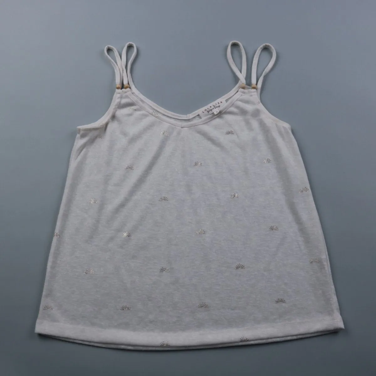 Женский топ LOLALIZA на тонких двойных бретелях, светло-серого меланжевого цвета с мелким золотистым принтом. Подойдёт для лета и для многослойных образов под жакет или кардиган. Лёгкий полиэстер быстро сохнет и прост в уходе.