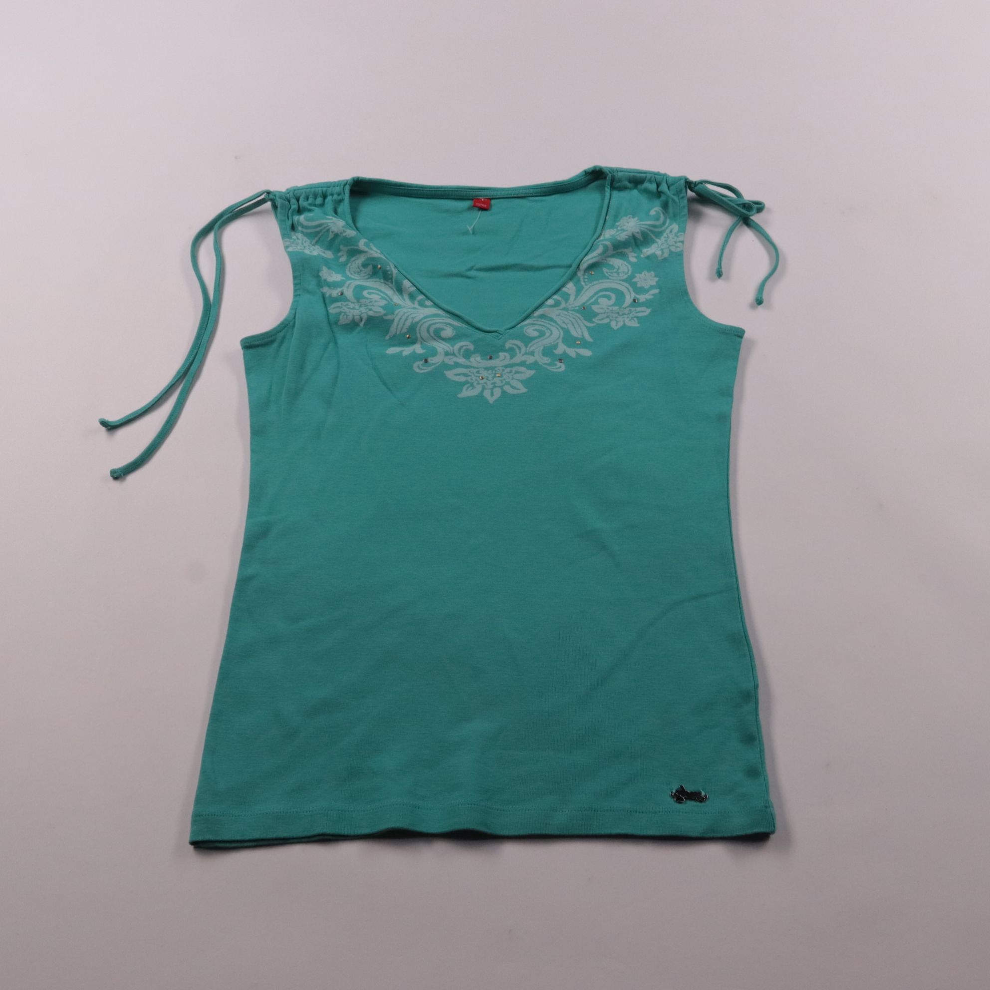 Женский топ Esprit бирюзового цвета с V-образным вырезом и принтом по линии декольте. На плечах есть завязки-кулиски, поэтому посадку можно немного регулировать. Подойдёт для лета и отдыха, лёгкий трикотаж удобно носить как самостоятельно, так и под жа...