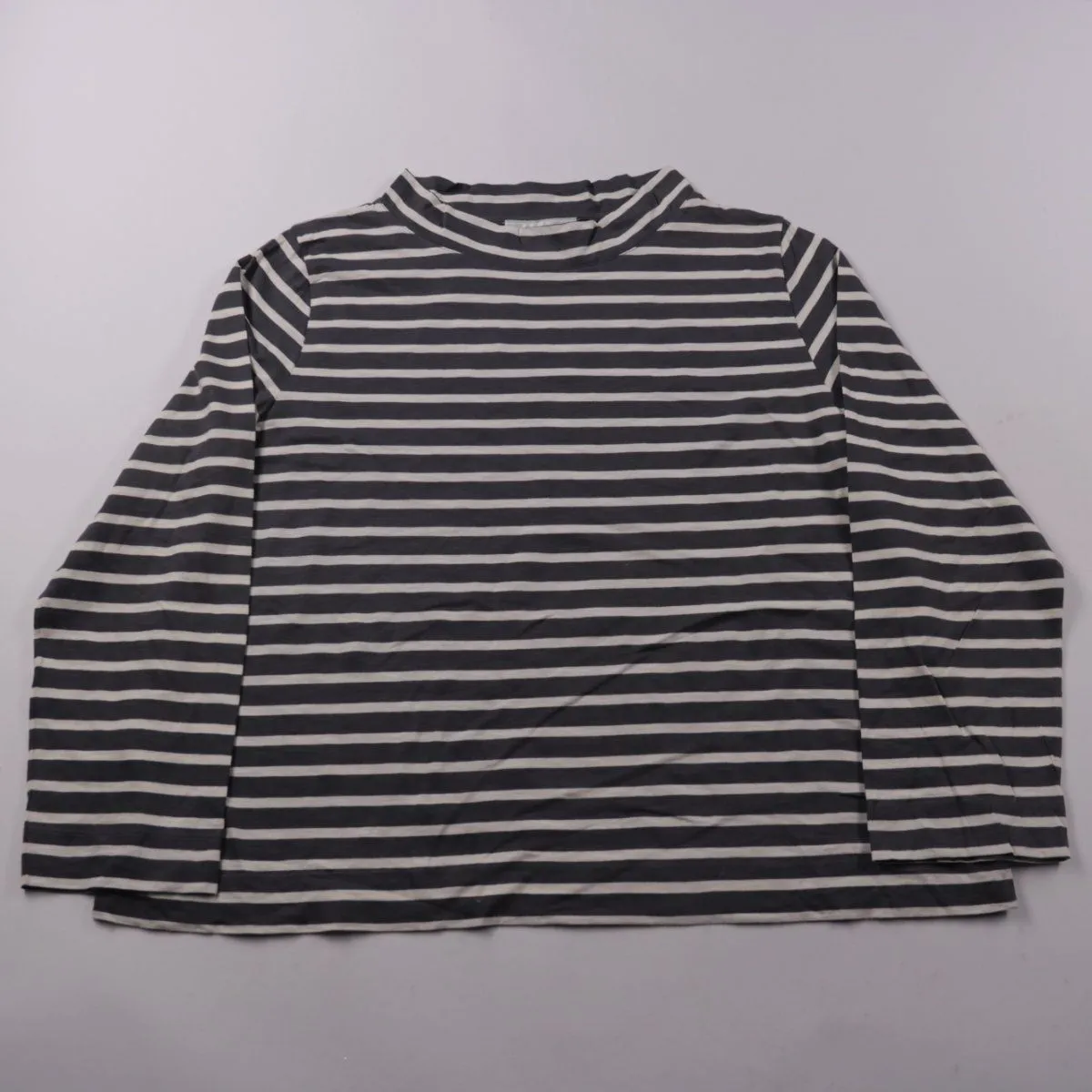 Женский лонгслив Carolyn Donnelly в серо-белую полоску из хлопка, с воротником-стойкой. Подойдёт для повседневных образов и многослойных комплектов в прохладную погоду. Натуральный материал хорошо дышит и комфортен в носке.