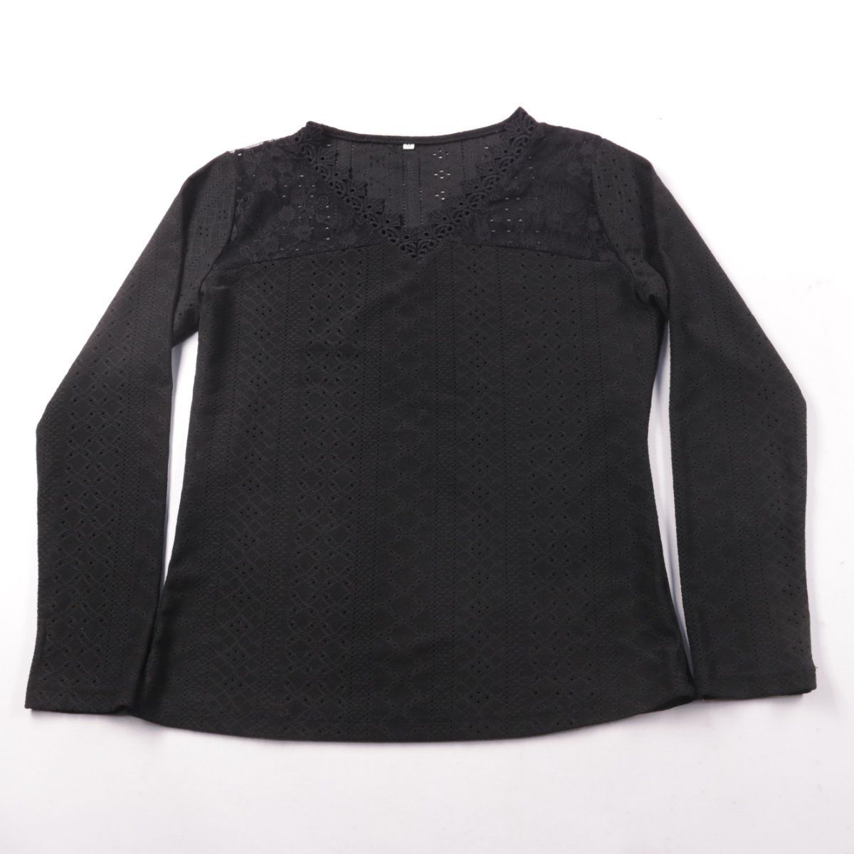 Женский чёрный лонгслив с кружевной отделкой по вырезу и фактурой с перфорацией. Подойдёт для повседневных образов и более аккуратных комплектов на работу в прохладную погоду. Практичный плюс — ткань тянется и проста в уходе.