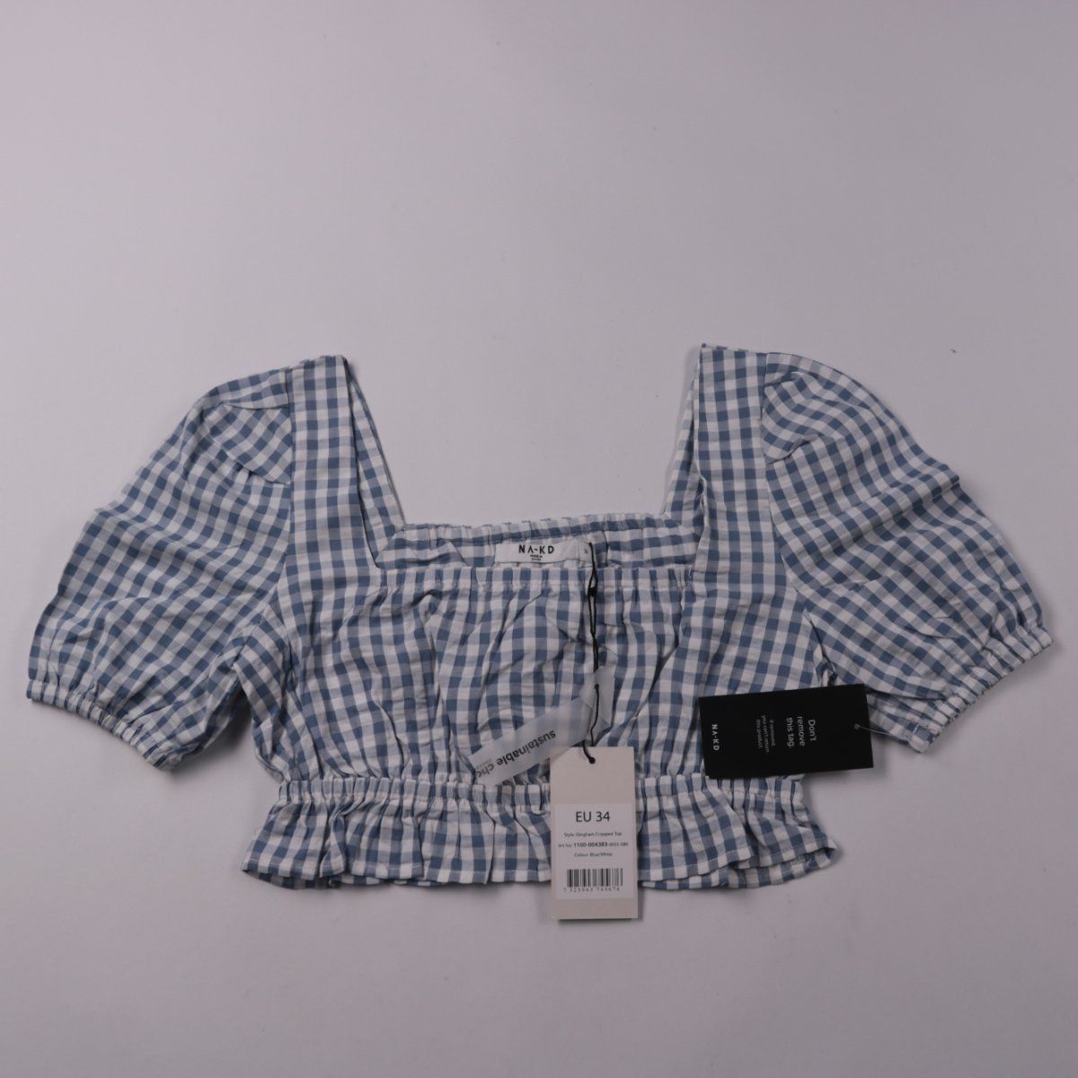 Укороченный топ NA-KD в голубую клетку с квадратным вырезом и объёмными рукавами-фонариками. Подойдёт для летних образов с джинсами, юбками или шортами. Хлопковая ткань и эластичная сборка по низу делают посадку комфортной.