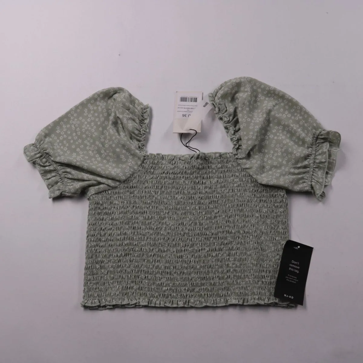 Кроп-топ NA-KD светло-зелёного цвета с мелким белым цветочным принтом, со сборкой-«смок» по корпусу и объёмными рукавами-фонариками. Подойдёт для летних образов с джинсами, шортами или юбкой. Эластичная сборка хорошо садится по фигуре и комфортна в носке.