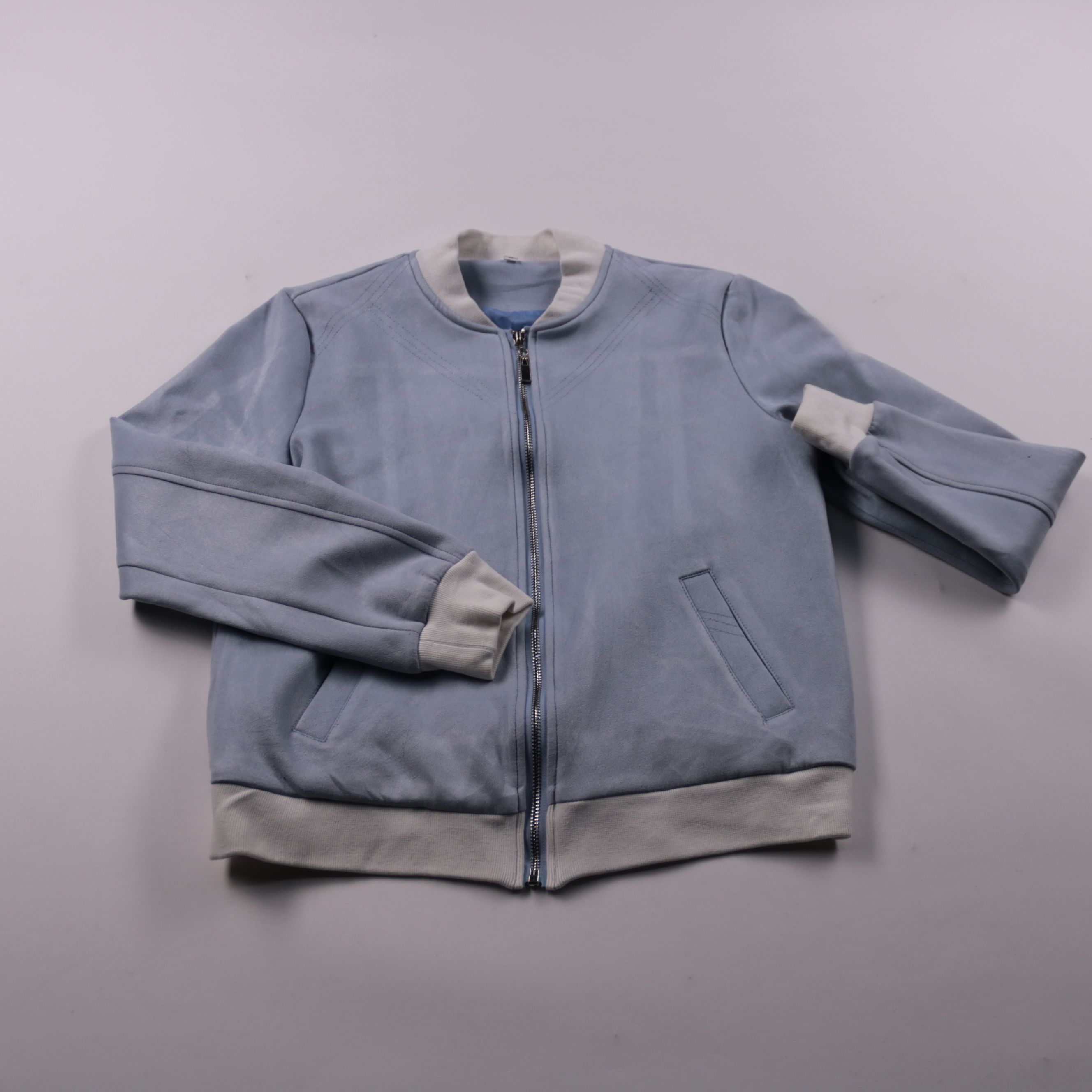 Бомбер на молнии в голубом цвете с контрастными белыми манжетами и поясом. Подойдёт для прохладной погоды и повседневных образов с джинсами или спортивными брюками. Лёгкий полиэстер быстро сохнет и не требует сложного ухода.
