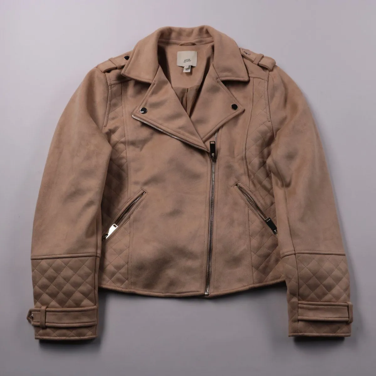 Косуха River Island из мягкой экозамши бежевого оттенка, с диагональной молнией и стёгаными вставками на рукавах. Подойдёт для прохладной весны/осени и повседневных образов с джинсами или платьем. Практичный плюс — лёгкая и удобная, не стесняет движения.