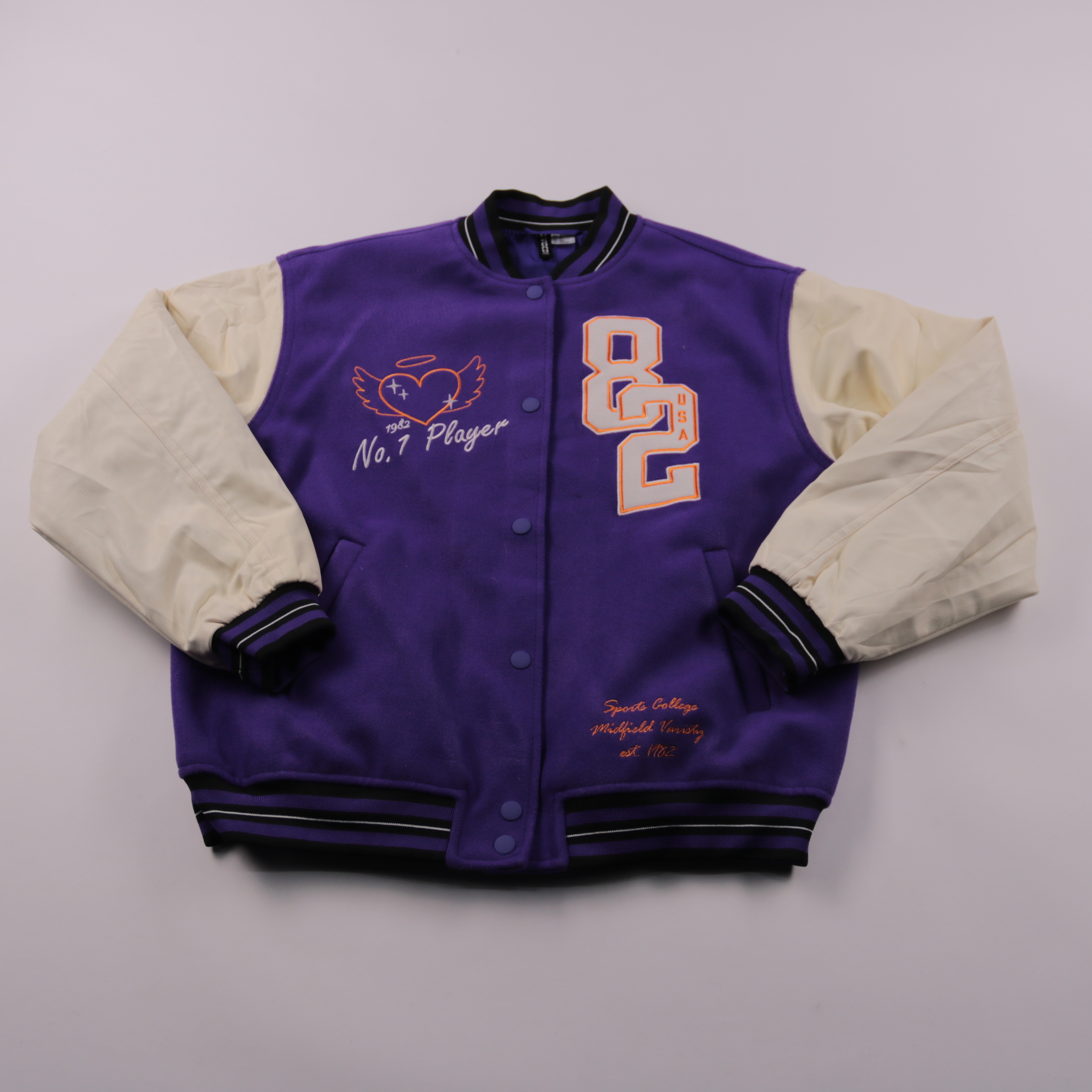 Лёгкая куртка-бомбер H&M в стиле varsity: фиолетовый корпус с контрастными светлыми рукавами и нашивками. Подойдёт для повседневных образов и прогулок в прохладную погоду. Удобная застёжка на кнопках и мягкие трикотажные манжеты помогают лучше держать ...