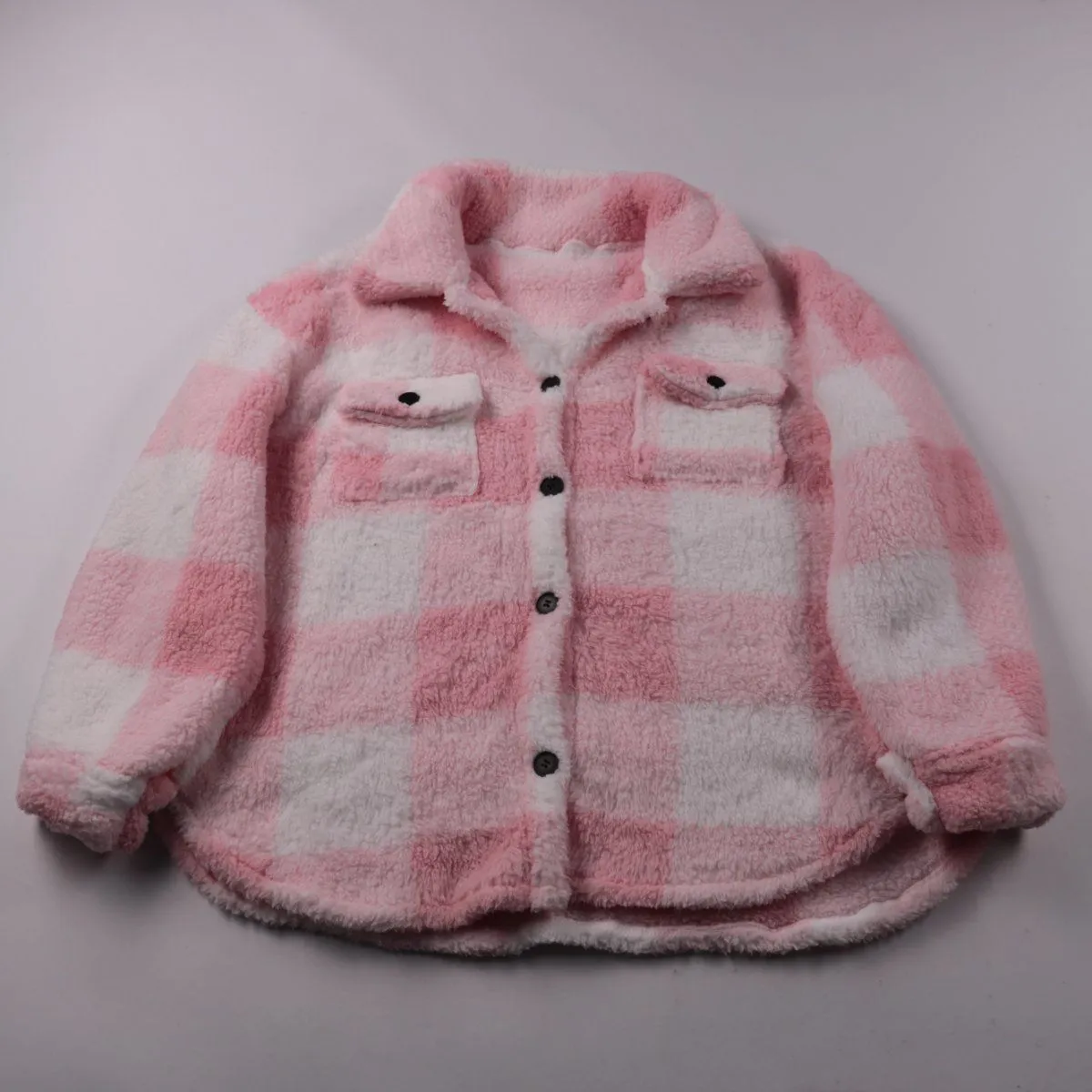 Мягкая куртка-рубашка в розово-белую клетку с воротником и застёжкой на пуговицы, есть накладные карманы на груди. Подойдёт для прохладной погоды и демисезона, удобно носить как верхний слой. Практичный плюс — уютный ворсистый материал и простая посадка для многослойных образов.