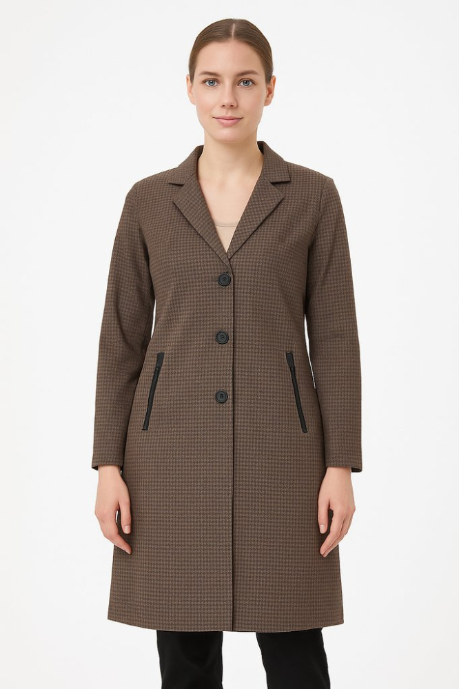 Женское пальто Zoso в коричневом цвете с мелким геометрическим принтом и классическим отложным воротником. Подойдёт для повседневных и офисных образов в демисезон, хорошо сочетается с базовыми брюками и обувью. Материал хлопковый со стрейчем, поэтому н...