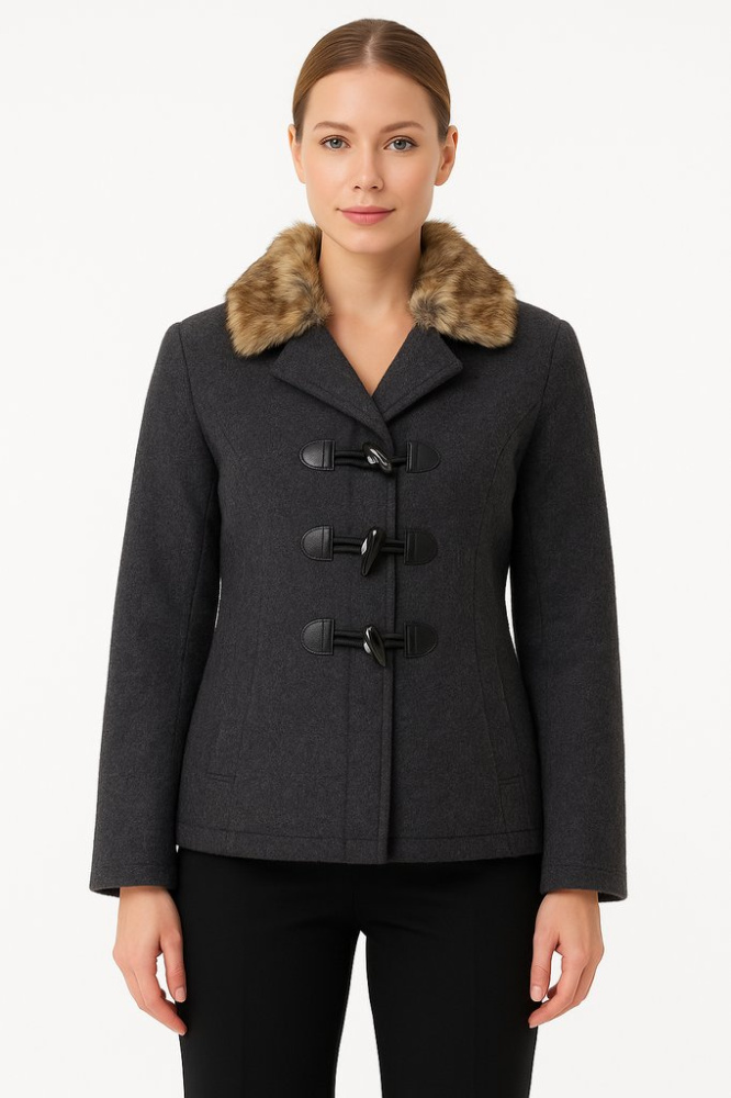 Женское пальто s.Oliver тёмно-серого цвета с меховым воротником и застёжками-«клыками». Подойдёт для повседневной носки в прохладную погоду и на работу, хорошо сочетается с базовыми вещами. Практичный материал с преобладанием акрила меньше мнётся и лег...