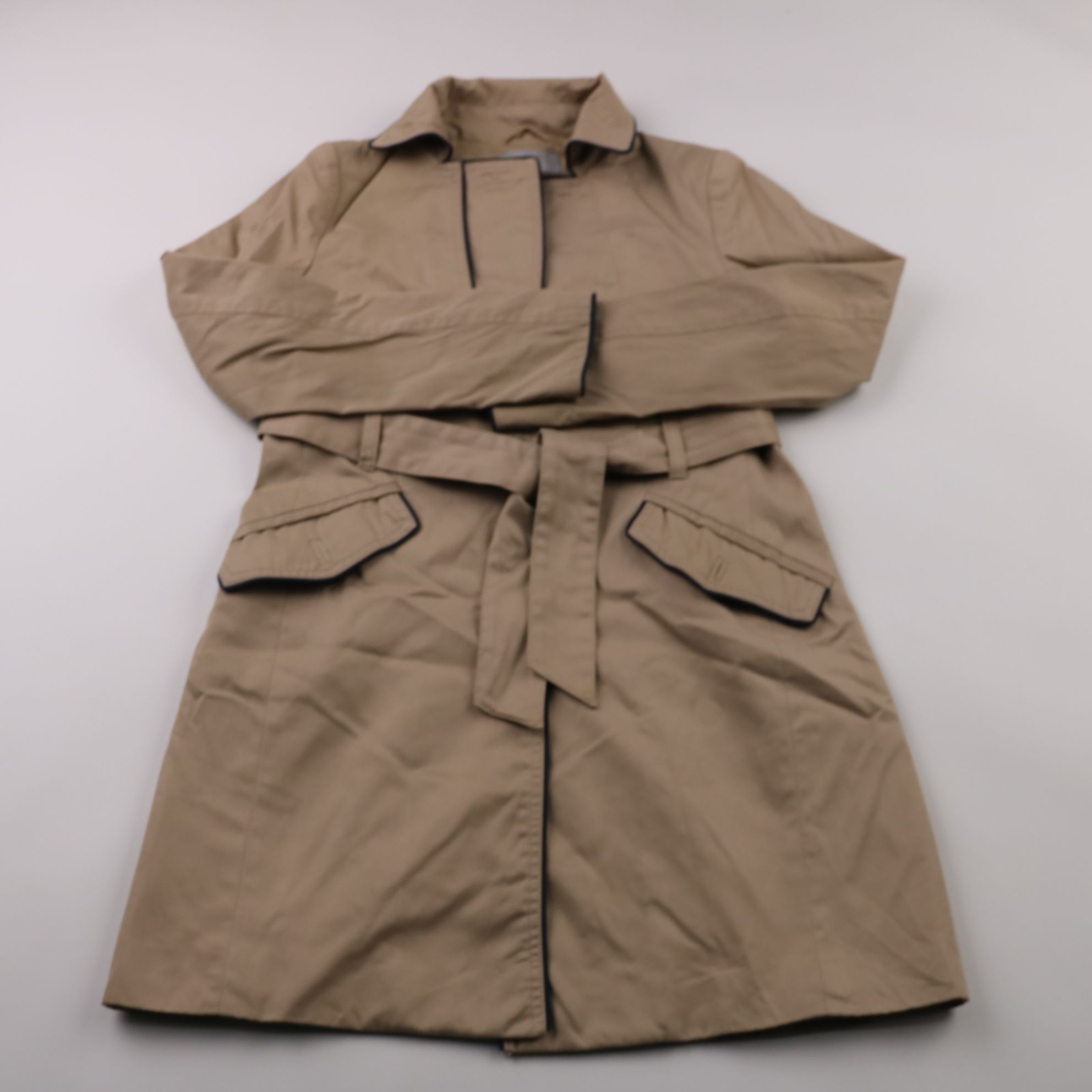 Женский плащ H&M бежевого цвета с поясом и накладными карманами с клапанами. Подойдёт для прохладной погоды весной и осенью, легко сочетается с повседневными и офисными образами. Практичный материал верха и подкладка делают его удобным для носки в городе.