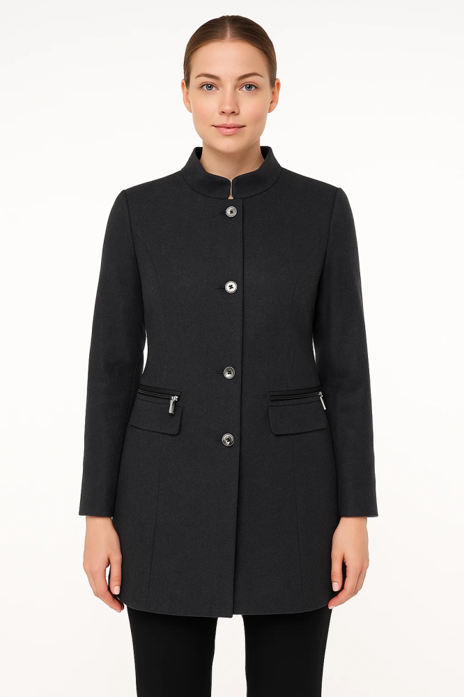 Женское пальто Gerry Weber Edition тёмно-серого/графитового цвета со стойкой и застёжкой на пуговицы. Подойдёт для города и офиса в прохладную погоду, легко сочетается с классической и повседневной одеждой. Практичный плюс — карманы на молниях, в них у...