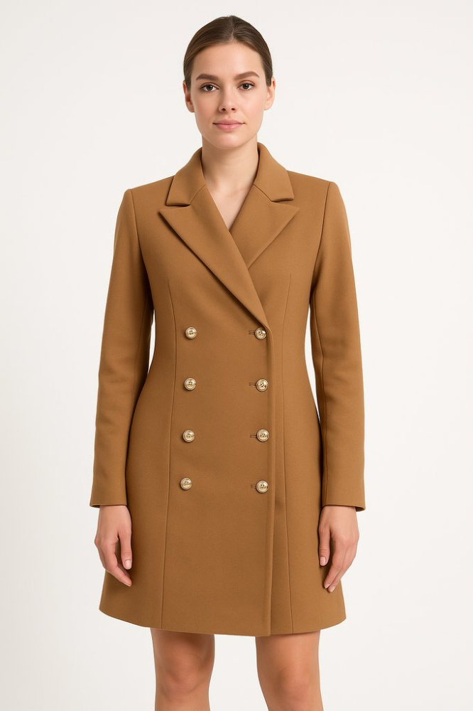 Женское двубортное пальто в карамельно-бежевом оттенке, приталенного кроя с лацканами и декоративными пуговицами. Подойдёт для повседневных образов и офиса в прохладную погоду весной и осенью. Ткань с добавлением спандекса слегка тянется и комфортно са...