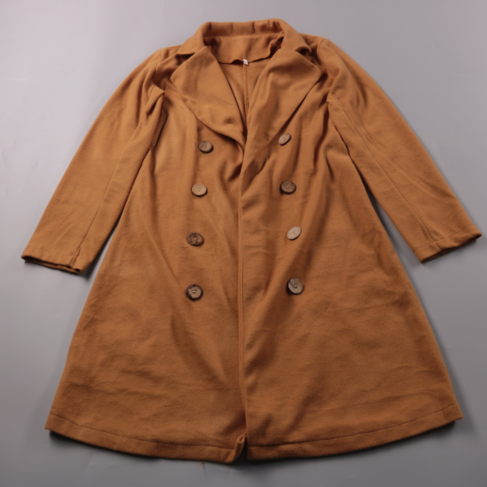 Женское двубортное пальто без бренда в тёплом рыже-коричневом оттенке, размер M. Подойдёт для повседневной носки в демисезон и прохладные дни, хорошо сочетается с базовыми вещами. Материал практичный: полиэстер легко чистится и быстро сохнет.