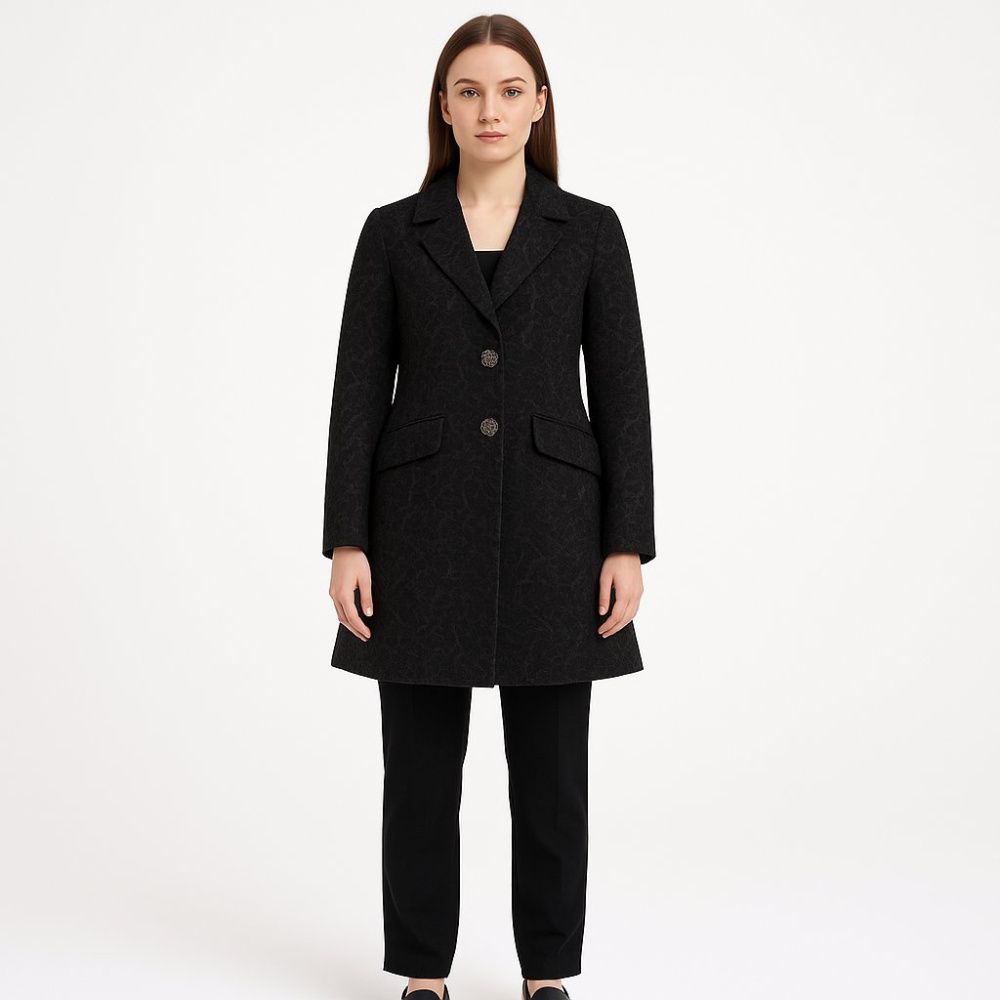 Пальто Atmosphere чёрного цвета с фактурной тканью и классическим воротником, застёгивается на пуговицы. Подойдёт для офиса и повседневных выходов в прохладную погоду, легко сочетается с брюками и платьями. Благодаря подкладке из полиэстера комфортно н...